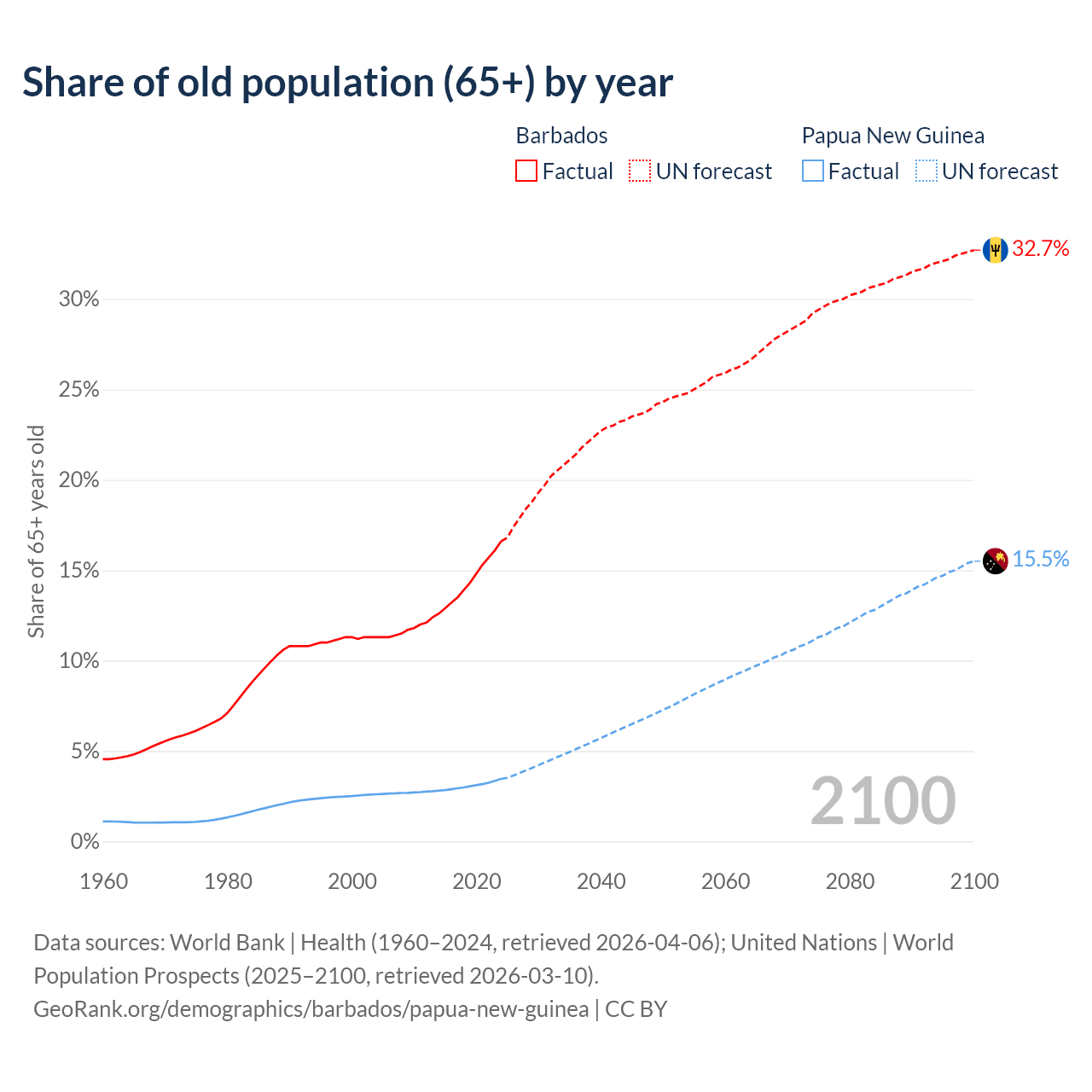 - The share of old-age demographic (65+) in Barbados is 16.6% vs 3.46% in Papua New Guinea.