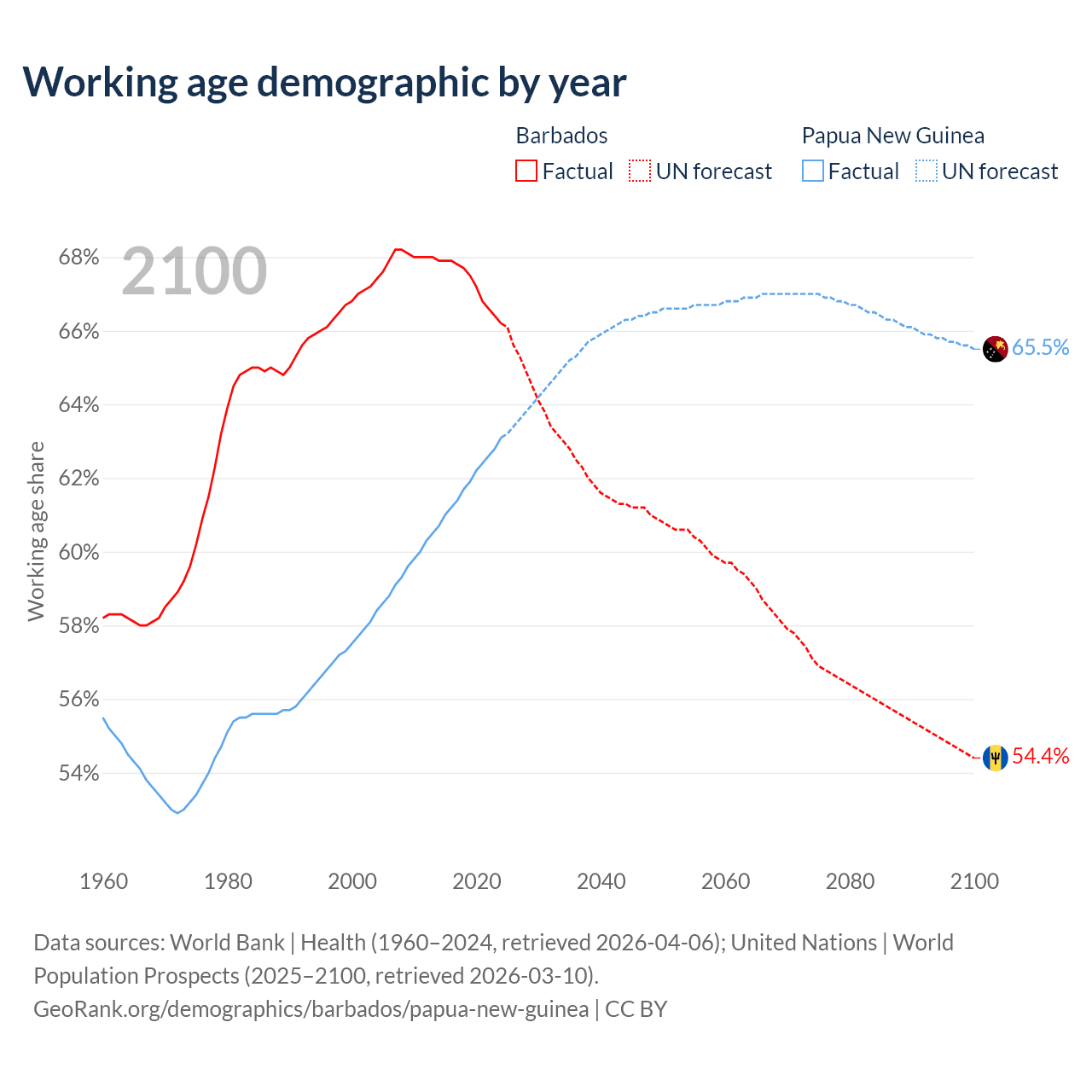 - Barbados has 187K working age adults (aged 15-64) vs 6.94M in Papua New Guinea.