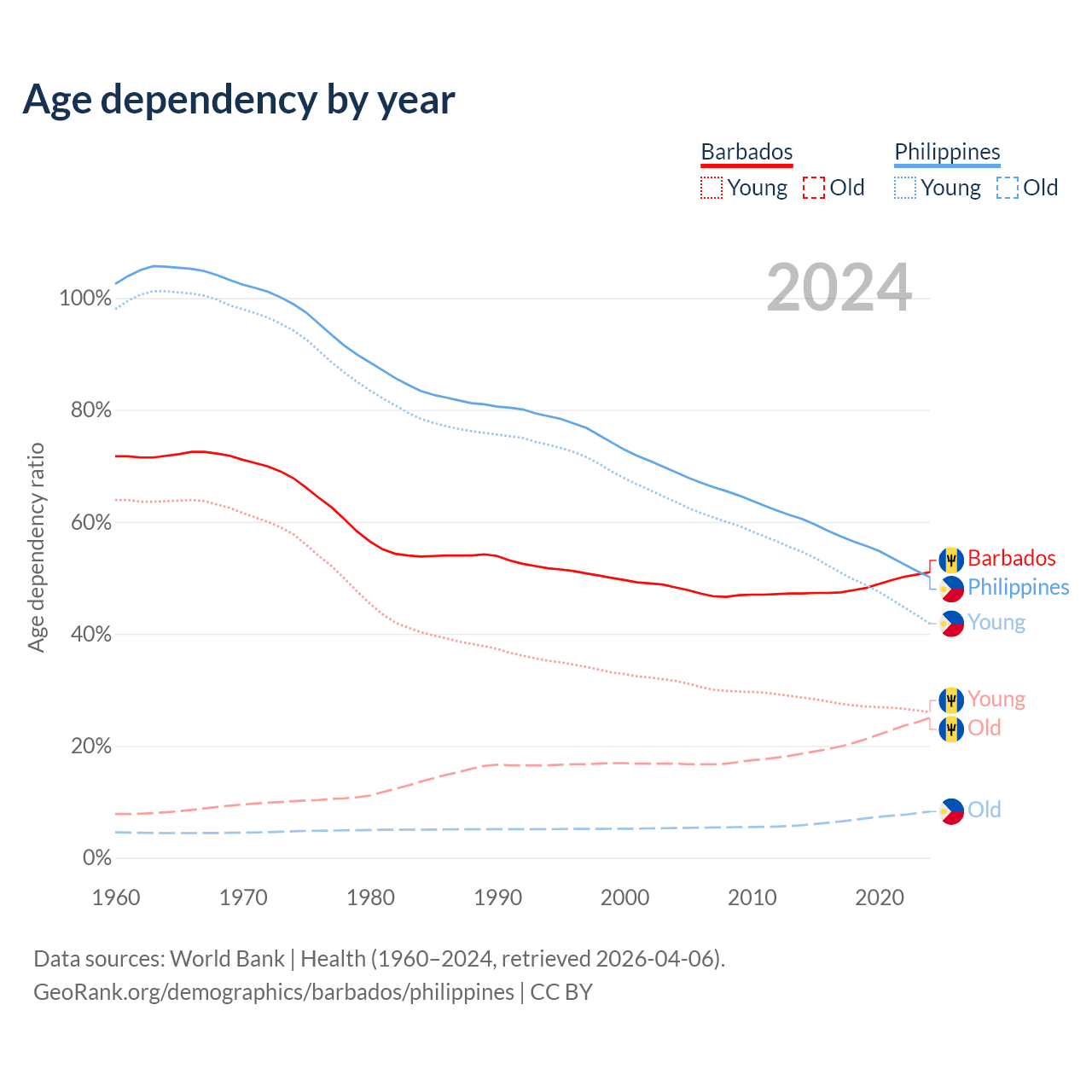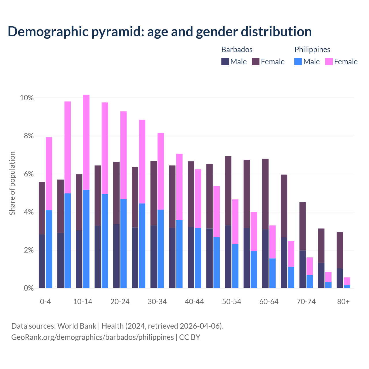 - Barbados is ranked 47/196 by median age (oldest to youngest) vs 123/196 for the Philippines.