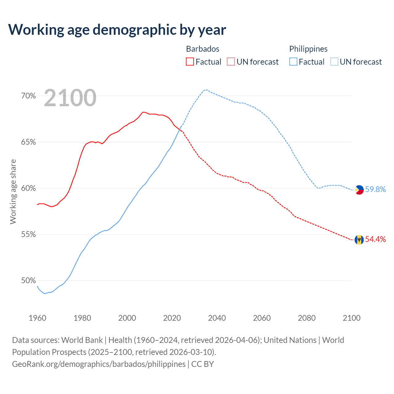 Median age Barbados vs Philippines, 1960-2100