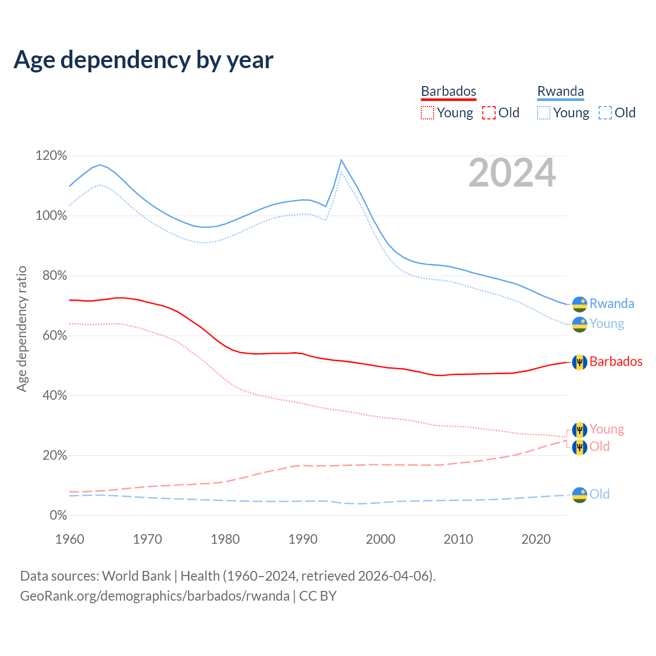 - The share of old-age demographic (65+) in Barbados is 16.6% vs 3.93% in Rwanda.