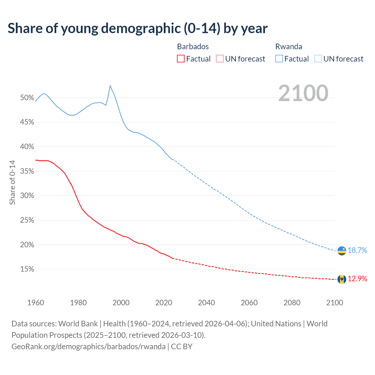 - The share of young demographic (0-15 years old) in Barbados is 17.2% vs 37.4% in Rwanda.