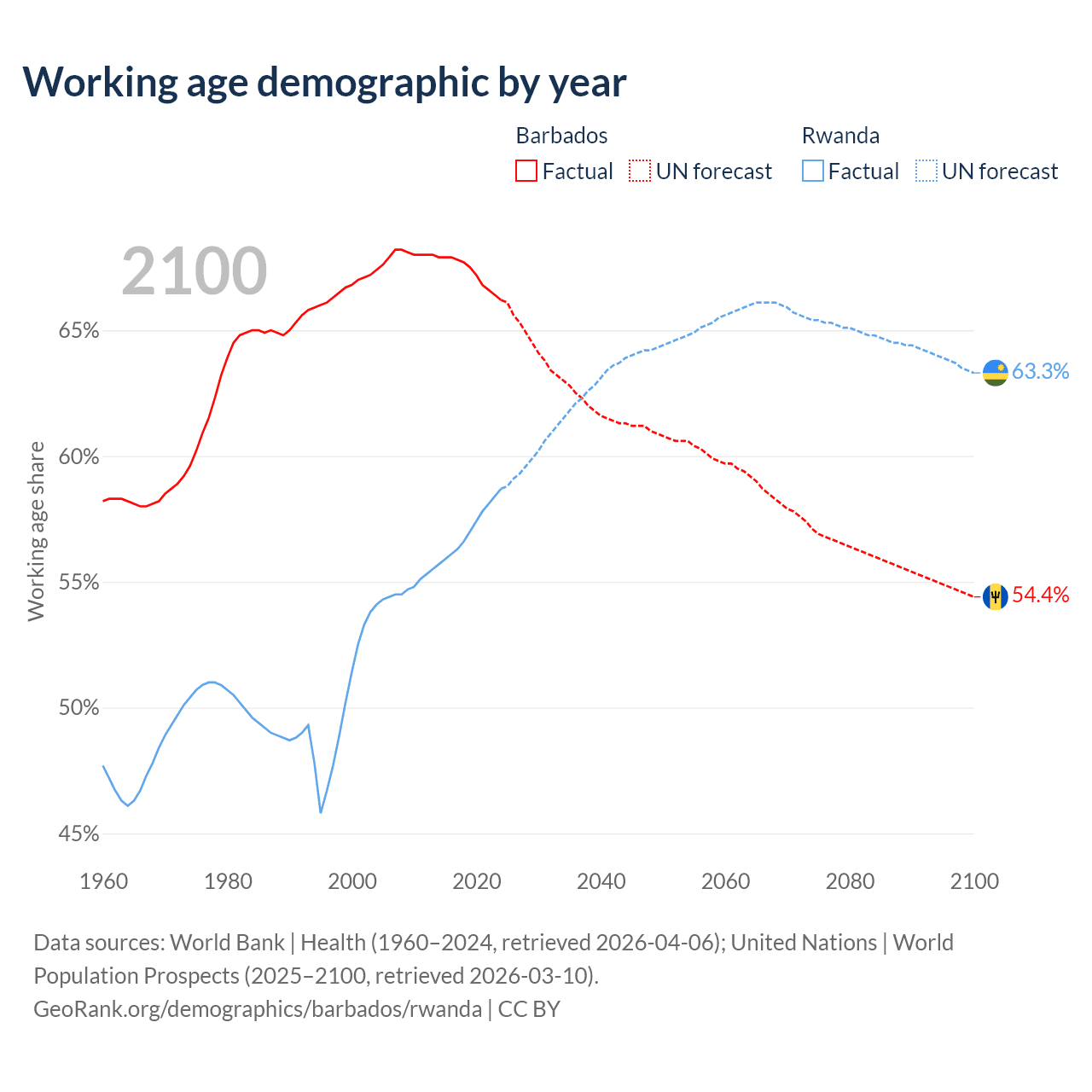 Median age Barbados vs Rwanda, 1960-2100