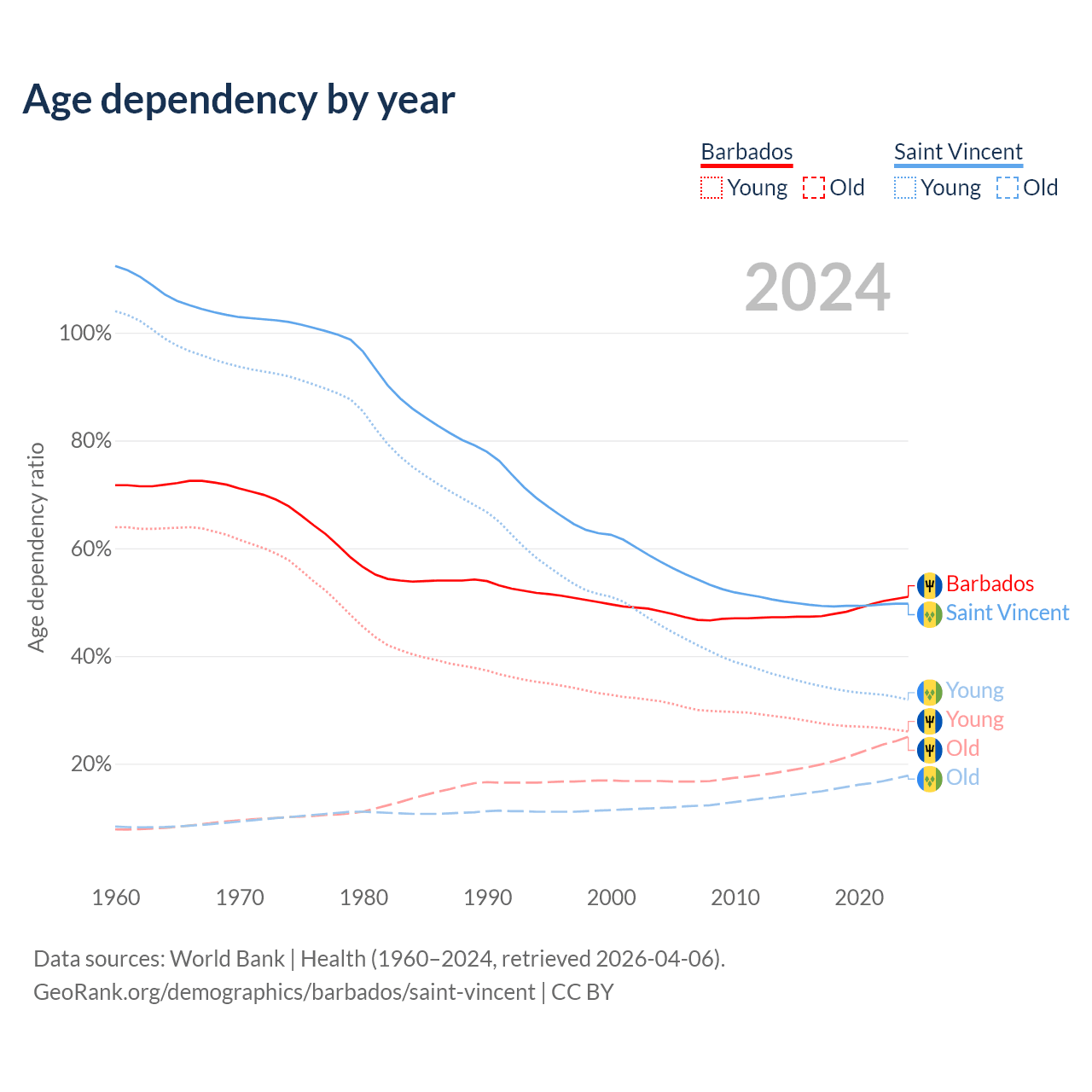 - Barbados is ranked 47/196 by median age (oldest to youngest) vs 75/196 for Saint Vincent.