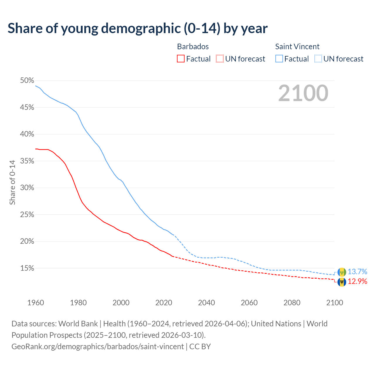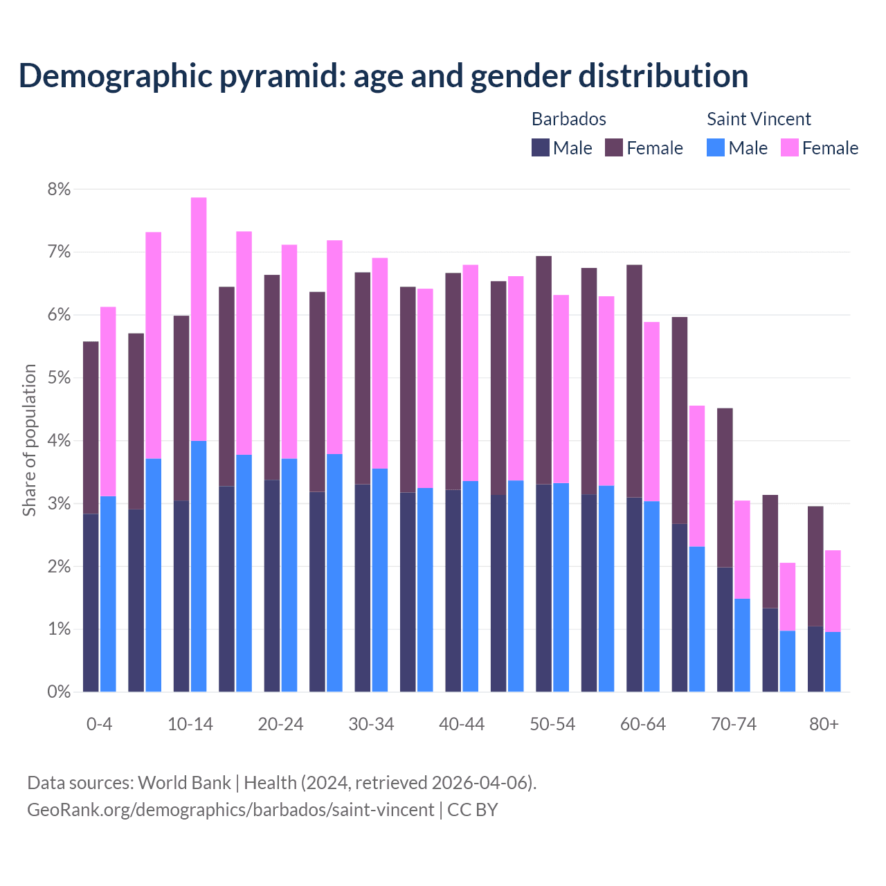 - The share of young demographic (0-15 years old) in Barbados is 17.2% vs 21.3% in Saint Vincent.