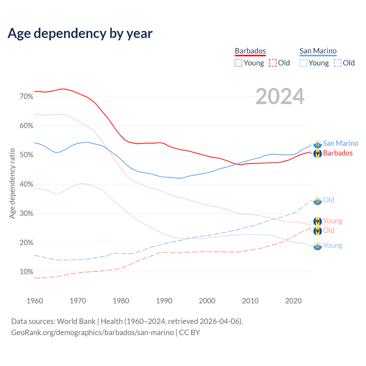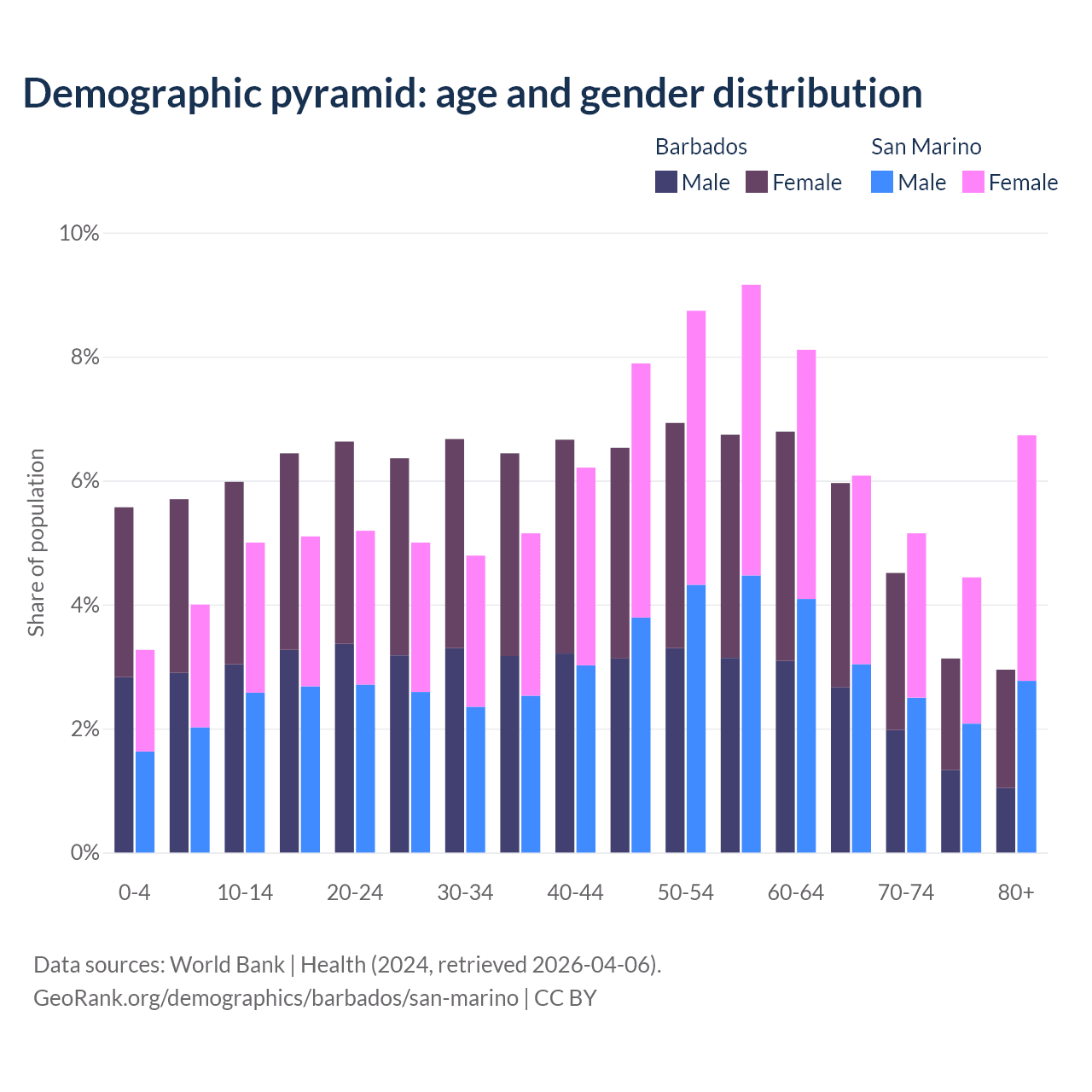 - Barbados is ranked 47/196 by median age (oldest to youngest) vs 3/196 for San Marino.