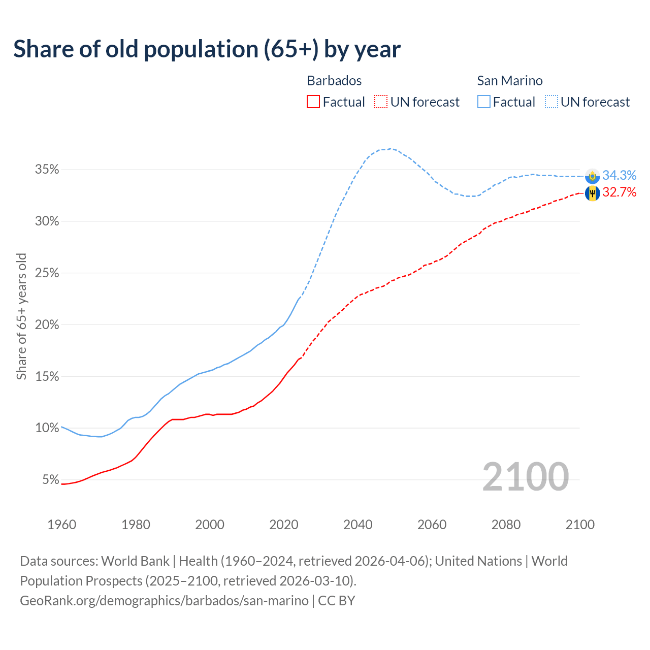 - The share of old-age demographic (65+) in Barbados is 16.6% vs 22.4% in San Marino.