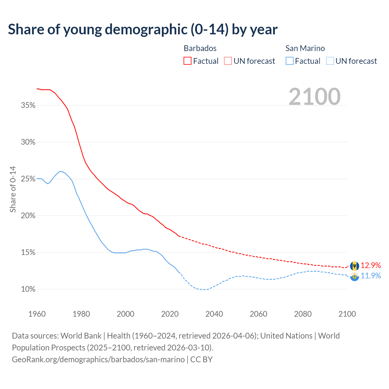 - The share of young demographic (0-15 years old) in Barbados is 17.2% vs 12.3% in San Marino.