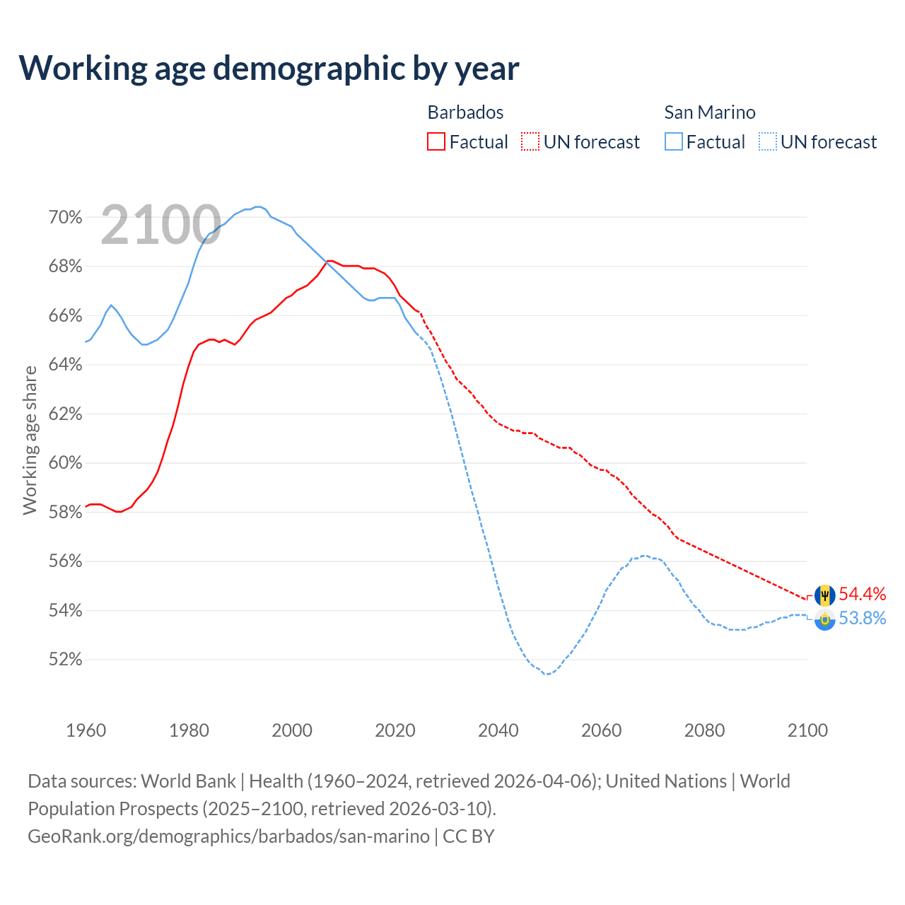 - Barbados has 187K working age adults (aged 15-64) vs 22.2K in San Marino.