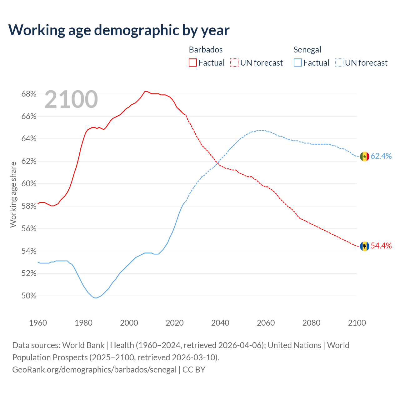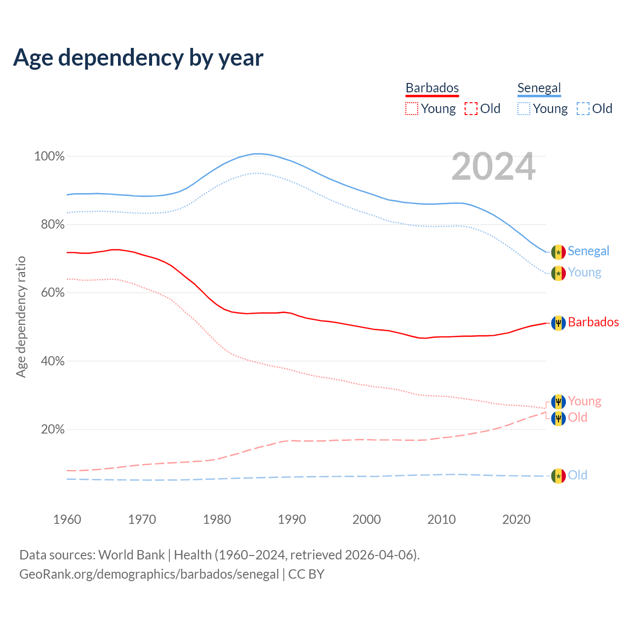 - Barbados is ranked 47/196 by median age (oldest to youngest) vs 162/196 for Senegal.