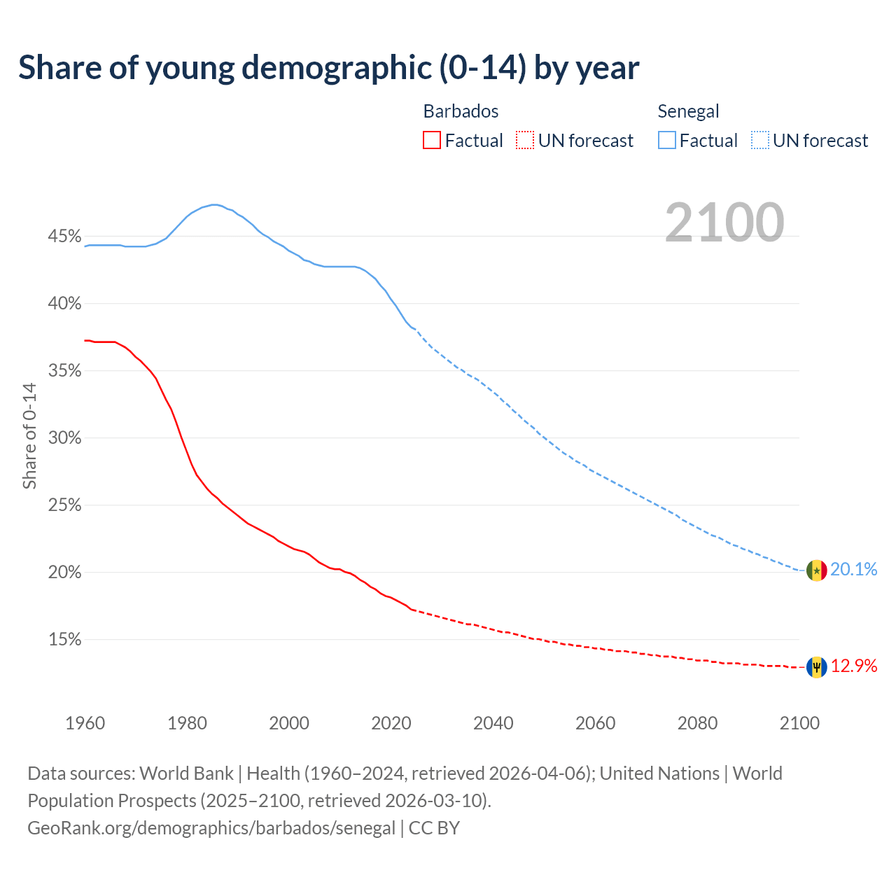 - The share of young demographic (0-15 years old) in Barbados is 17.2% vs 38.2% in Senegal.