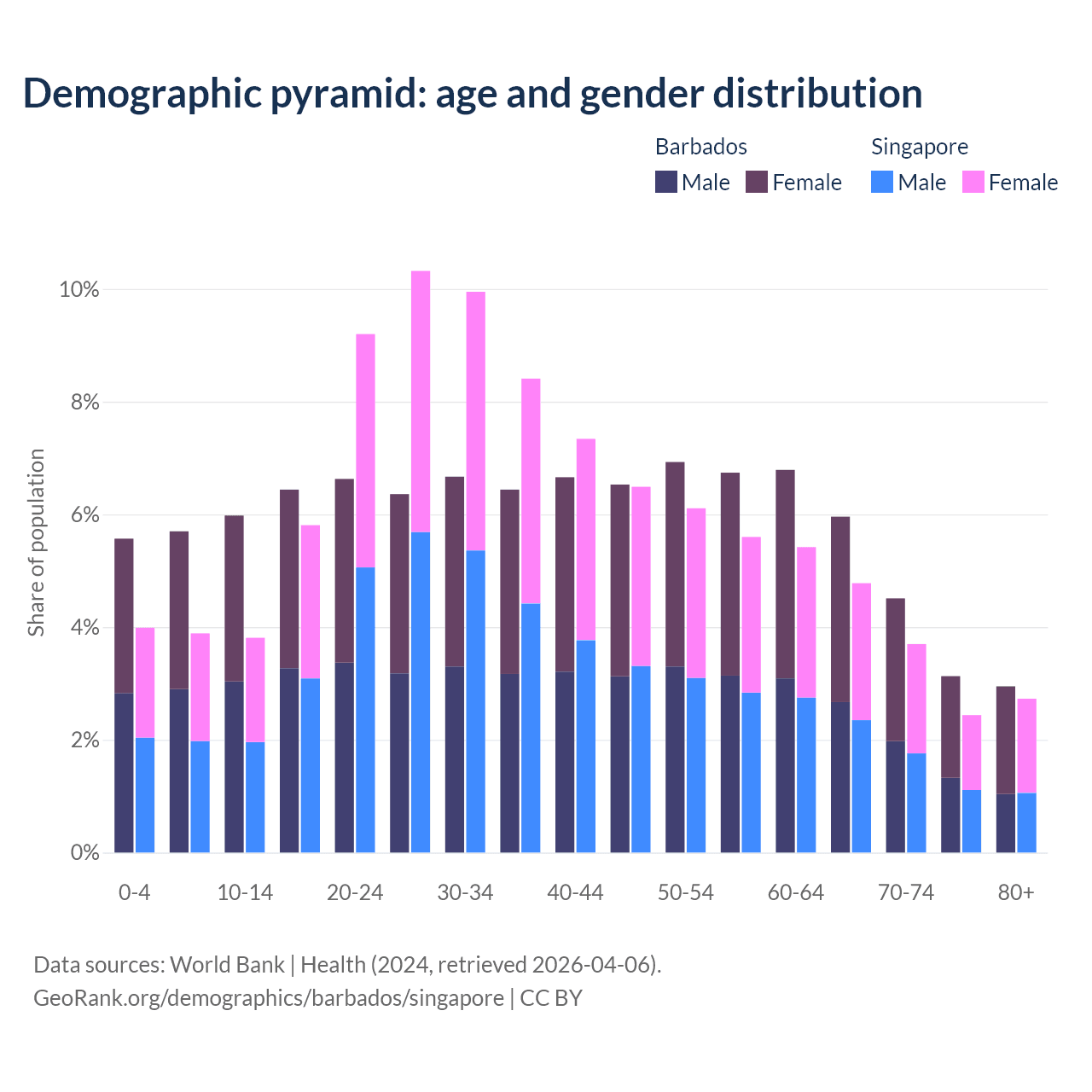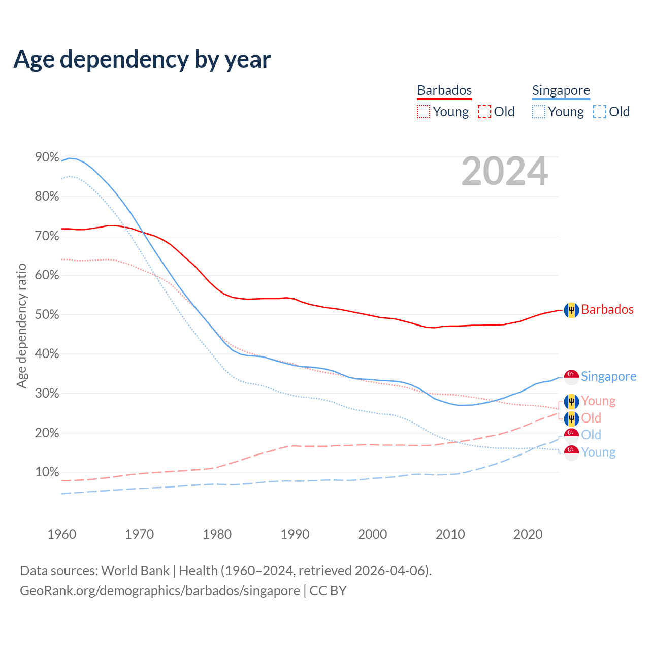 - Barbados is ranked 47/196 by median age (oldest to youngest) vs 68/196 for Singapore.