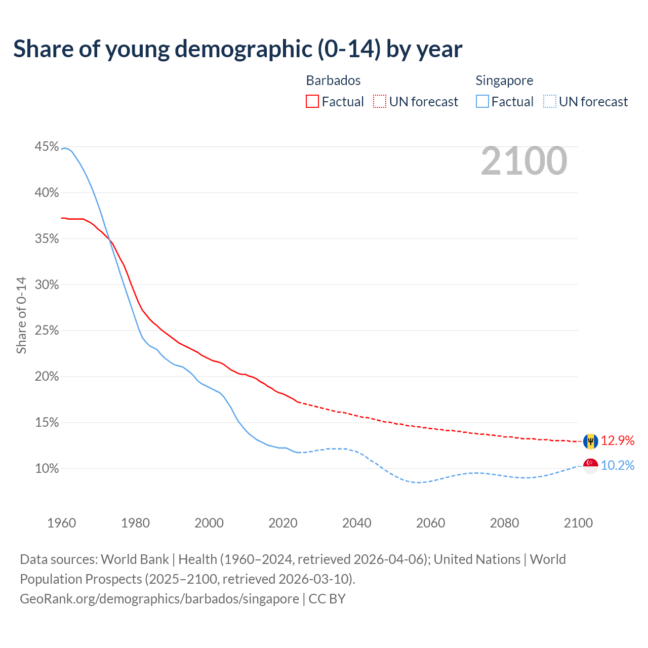 - The share of young demographic (0-15 years old) in Barbados is 17.2% vs 11.7% in Singapore.