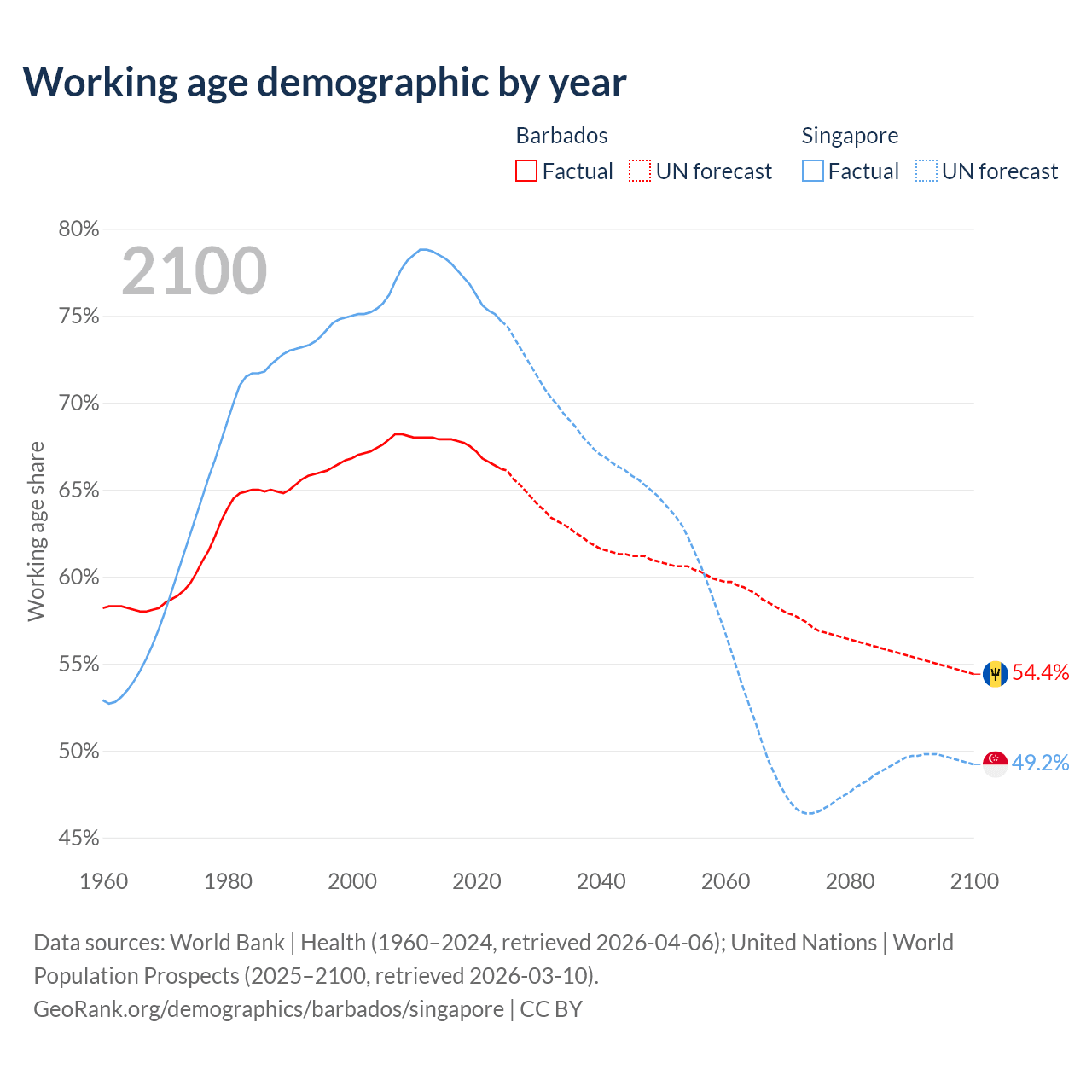 Median age Barbados vs Singapore, 1960-2100