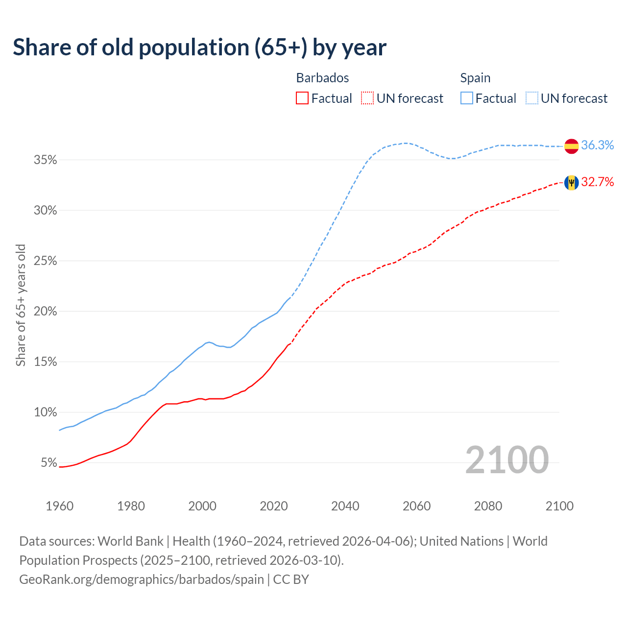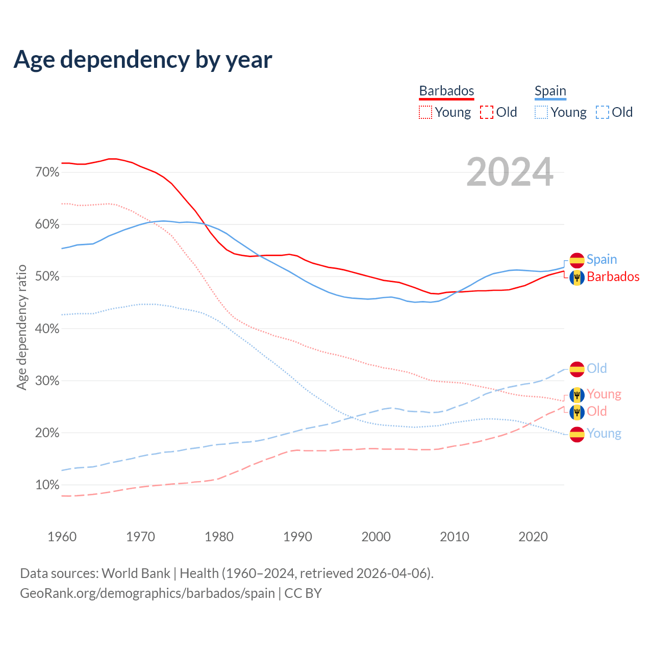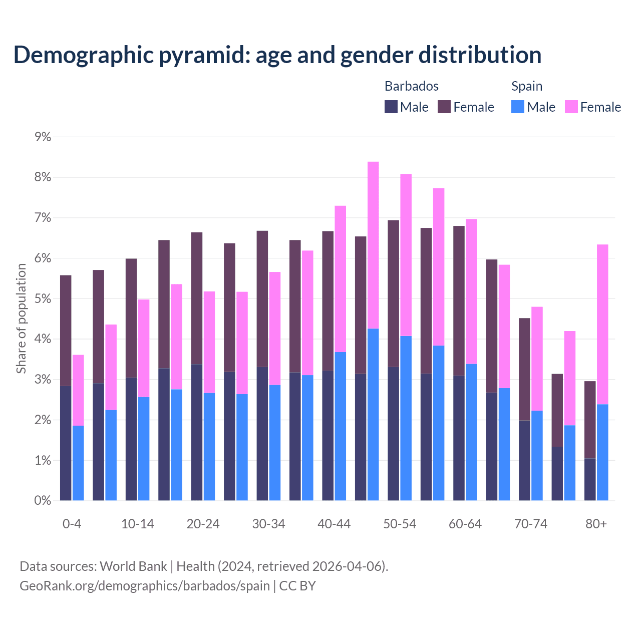 - Barbados is ranked 47/196 by median age (oldest to youngest) vs 7/196 for Spain.