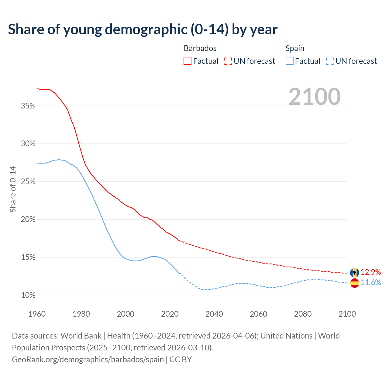 - The share of young demographic (0-15 years old) in Barbados is 17.2% vs 12.9% in Spain.