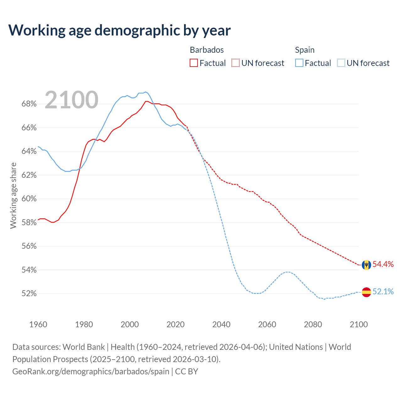 - Barbados has 187K working age adults (aged 15-64) vs 32.2M in Spain.