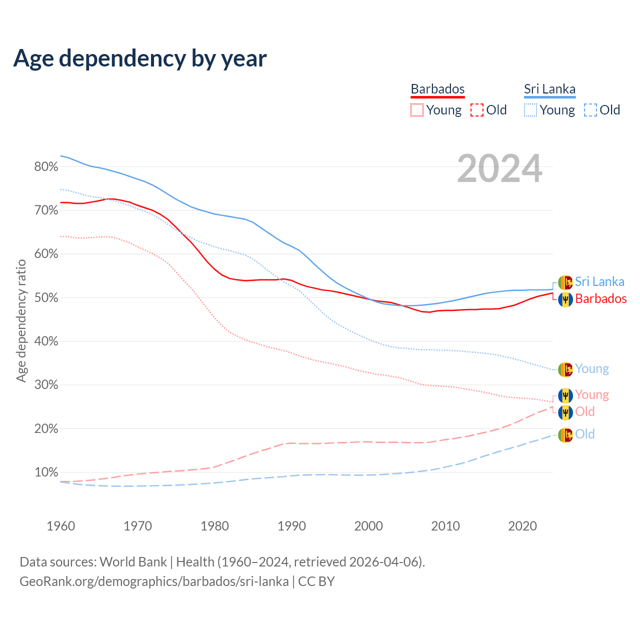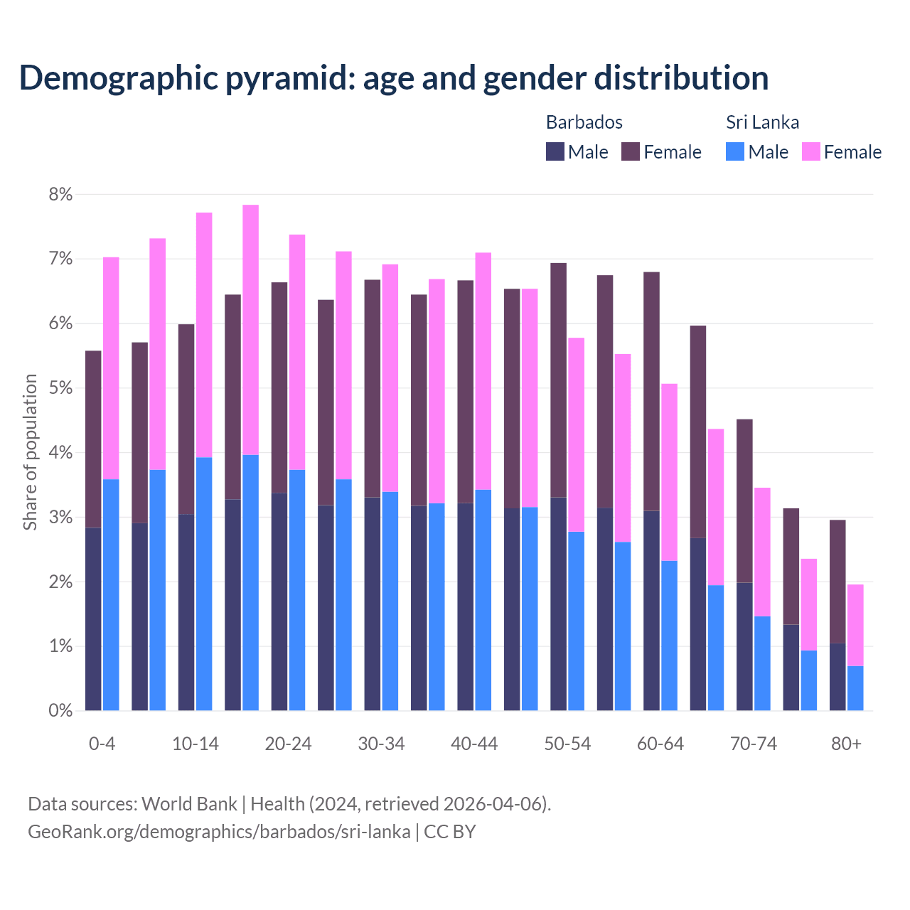 - Barbados is ranked 47/196 by median age (oldest to youngest) vs 81/196 for Sri Lanka.