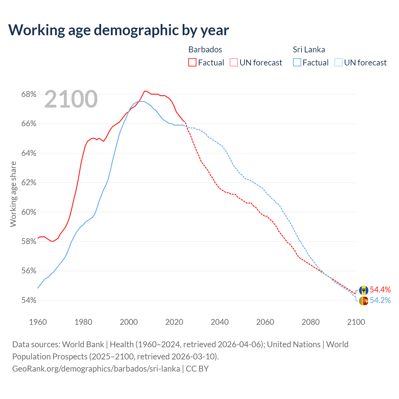 - Barbados has 187K working age adults (aged 15-64) vs 14.6M in Sri Lanka.