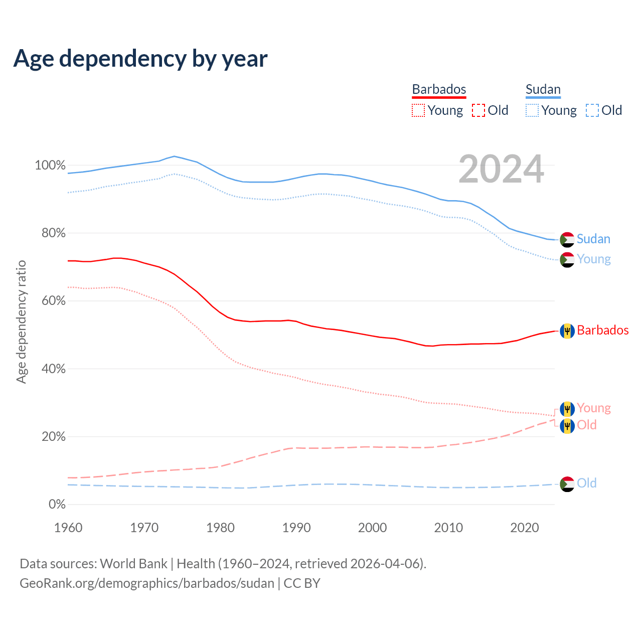 - Barbados is ranked 47/196 by median age (oldest to youngest) vs 172/196 for Sudan.