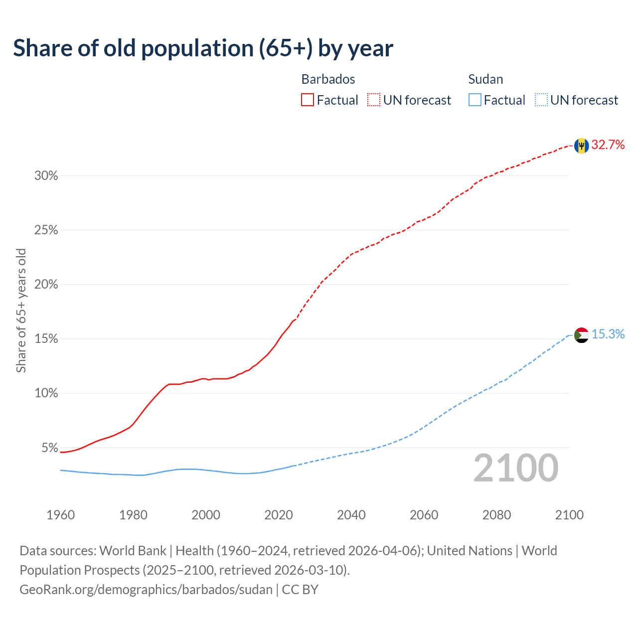 - The share of old-age demographic (65+) in Barbados is 16.6% vs 3.3% in Sudan.