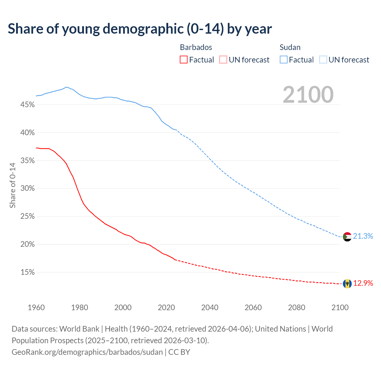 - The share of young demographic (0-15 years old) in Barbados is 17.2% vs 40.5% in Sudan.