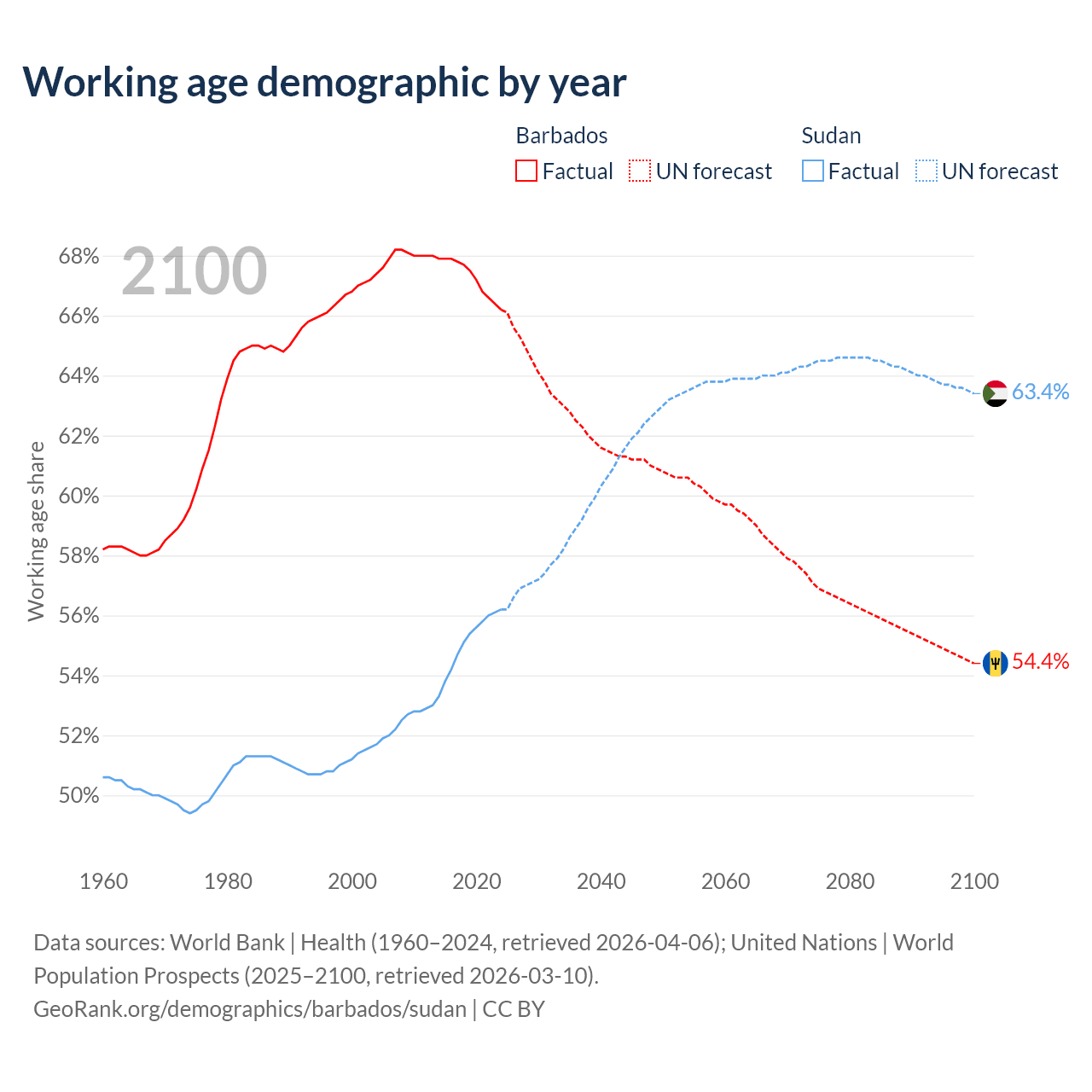 - Barbados has 187K working age adults (aged 15-64) vs 30M in Sudan.
