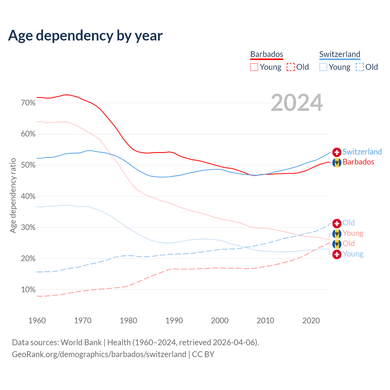 - Barbados is ranked 47/196 by median age (oldest to youngest) vs 24/196 for Switzerland.