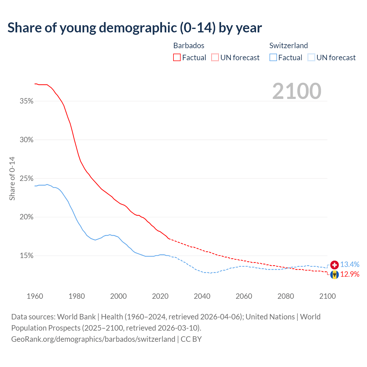 - The share of young demographic (0-15 years old) in Barbados is 17.2% vs 15% in Switzerland.