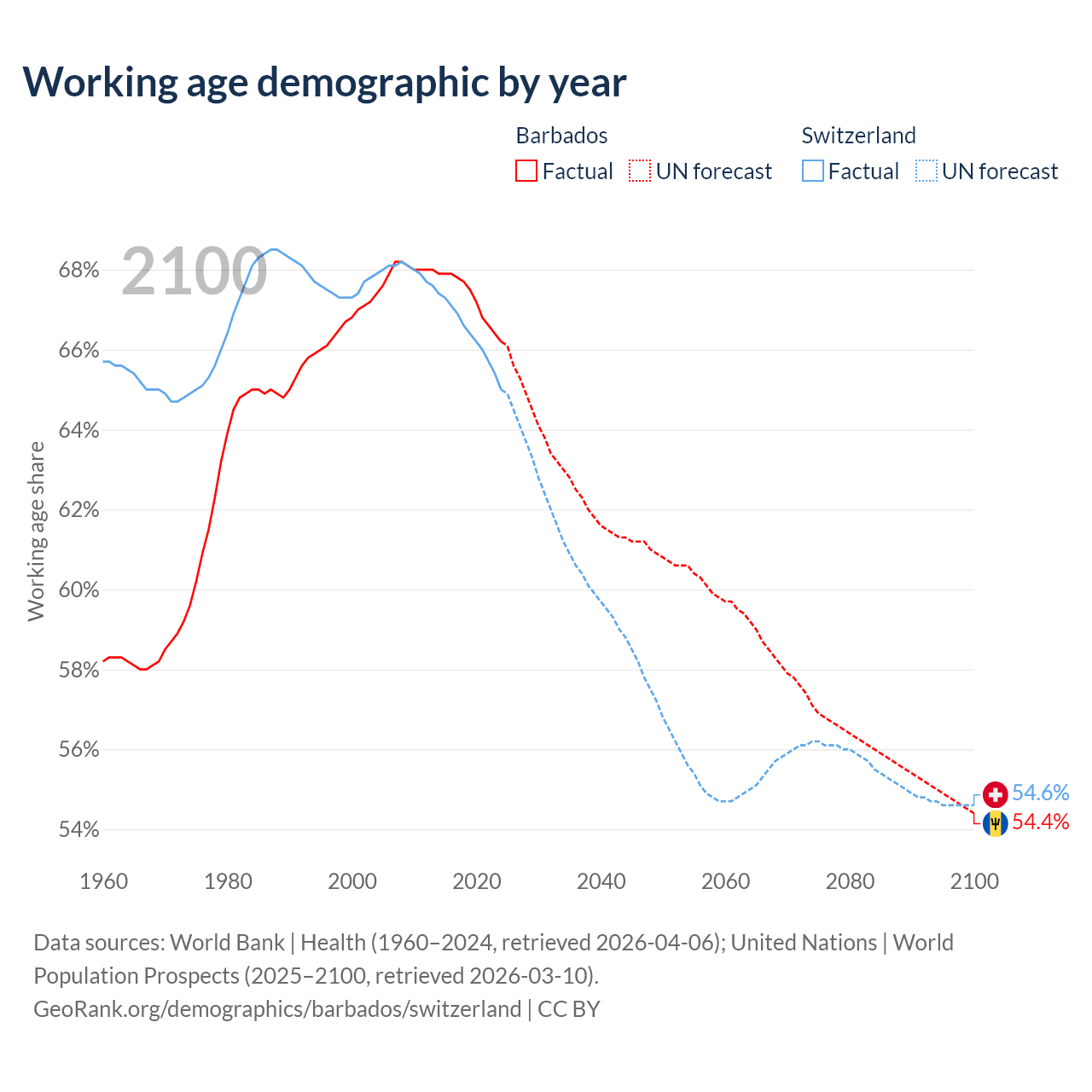 Median age Barbados vs Switzerland, 1960-2100