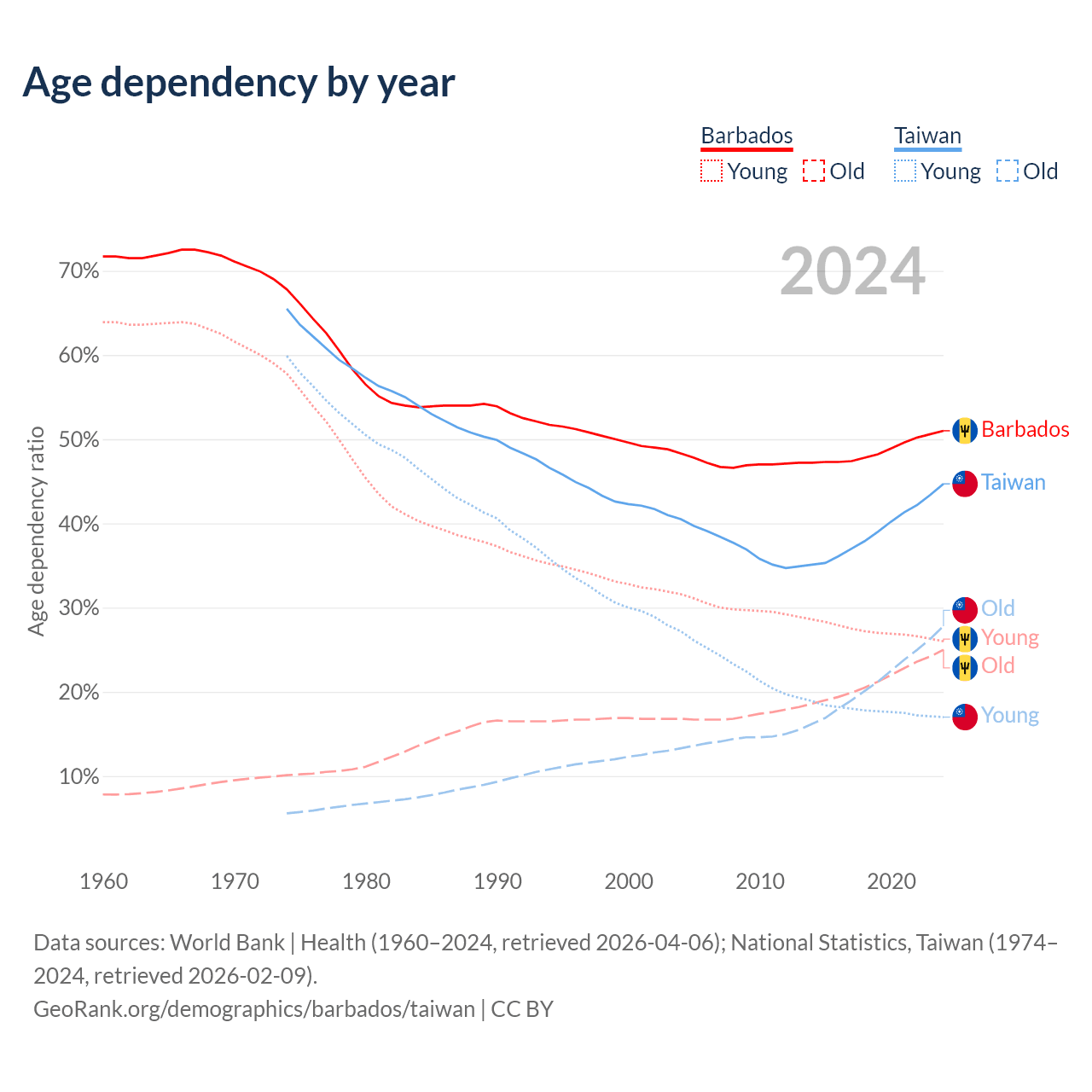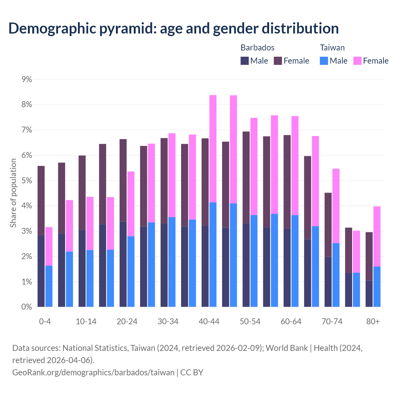 - Barbados is ranked 47/196 by median age (oldest to youngest) vs 16/196 for Taiwan.