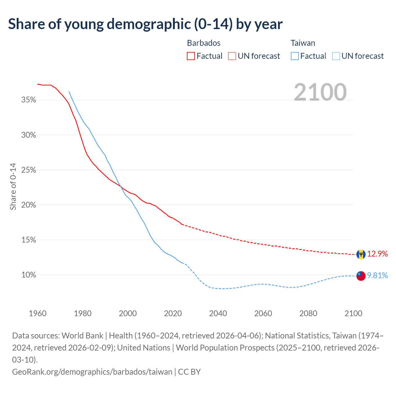 - The share of young demographic (0-15 years old) in Barbados is 17.2% vs 11.7% in Taiwan.