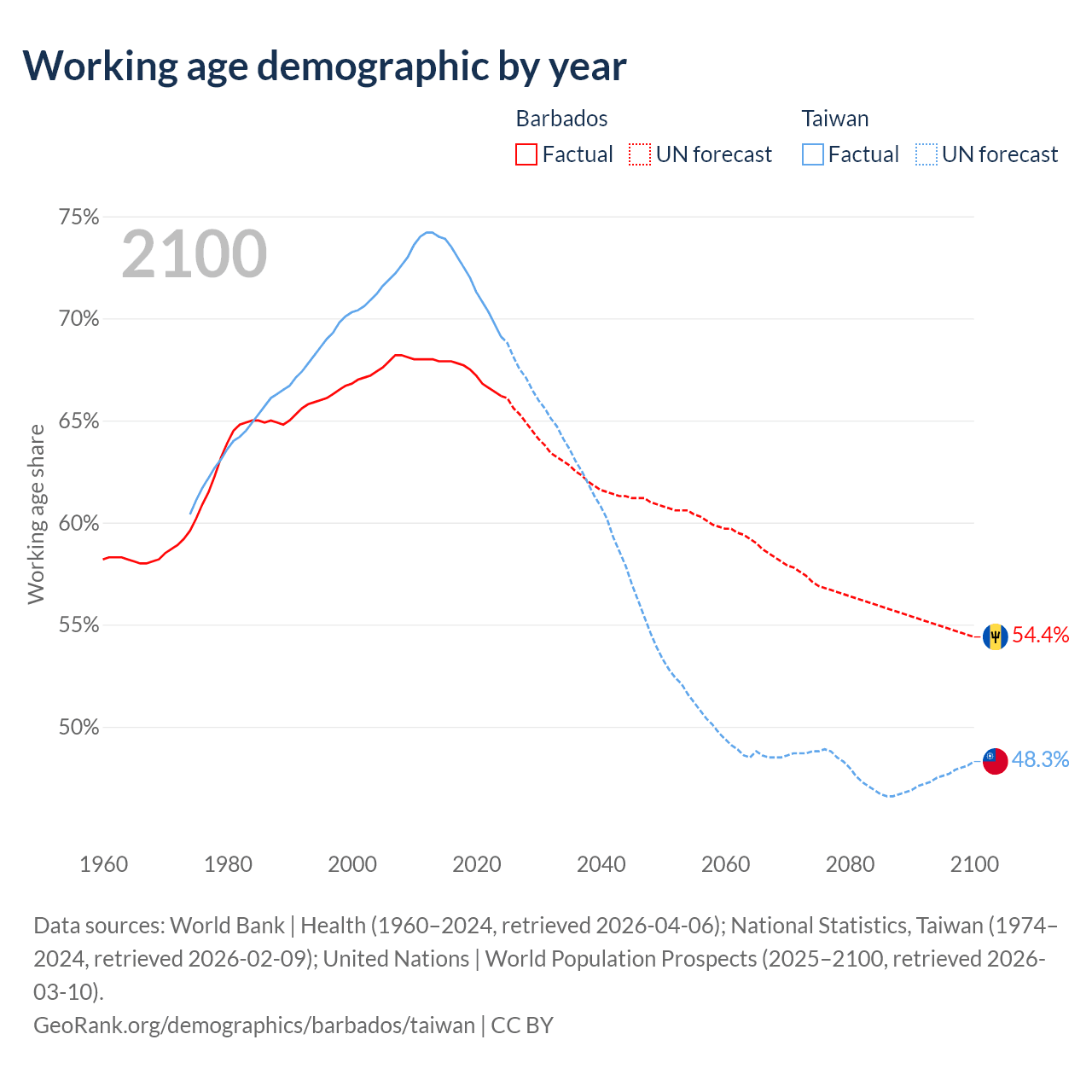 - Barbados has 187K working age adults (aged 15-64) vs 16.1M in Taiwan.