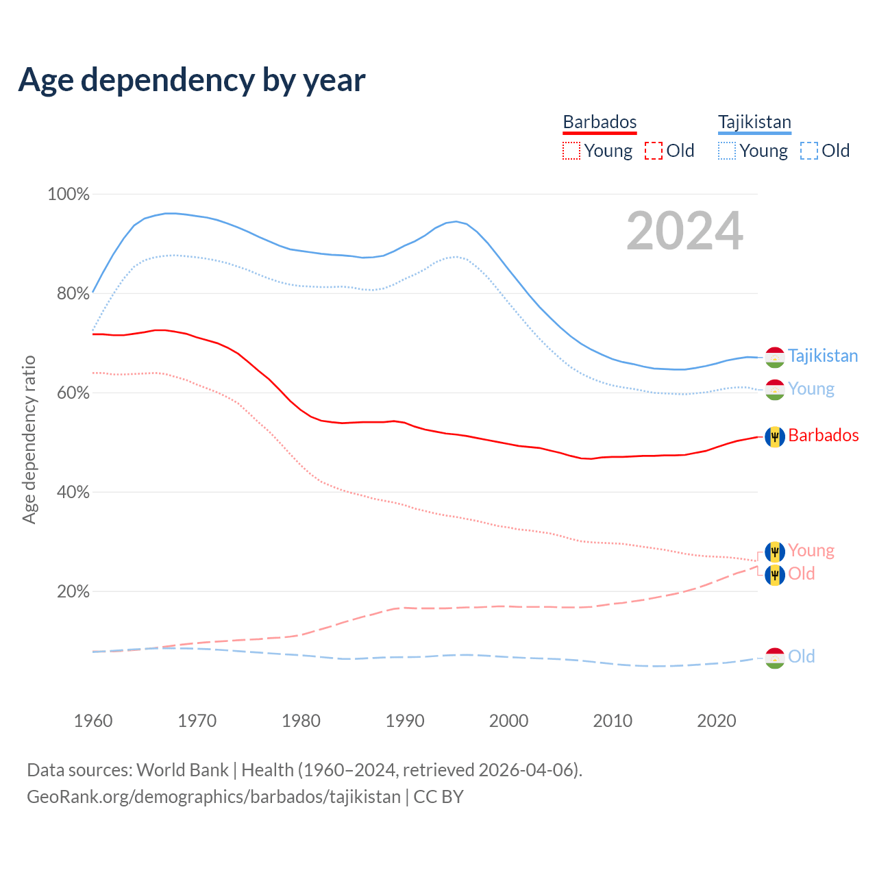 - The share of old-age demographic (65+) in Barbados is 16.6% vs 3.85% in Tajikistan.