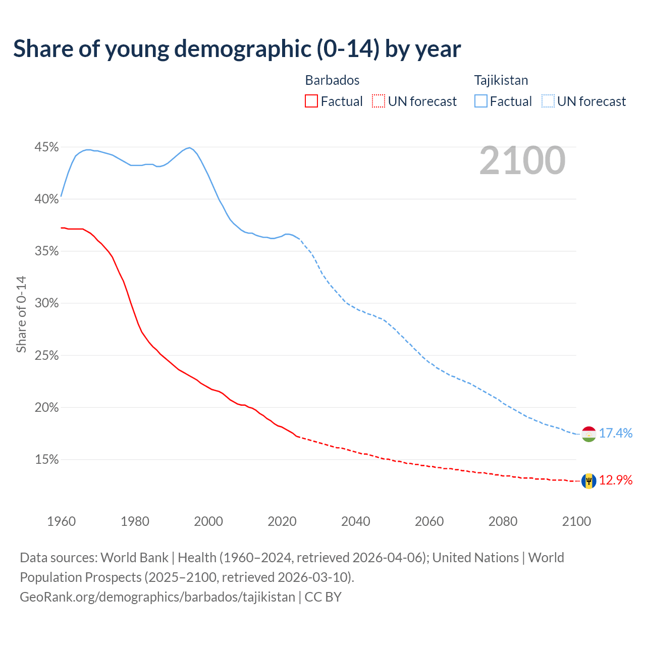 - The share of young demographic (0-15 years old) in Barbados is 17.2% vs 36.3% in Tajikistan.