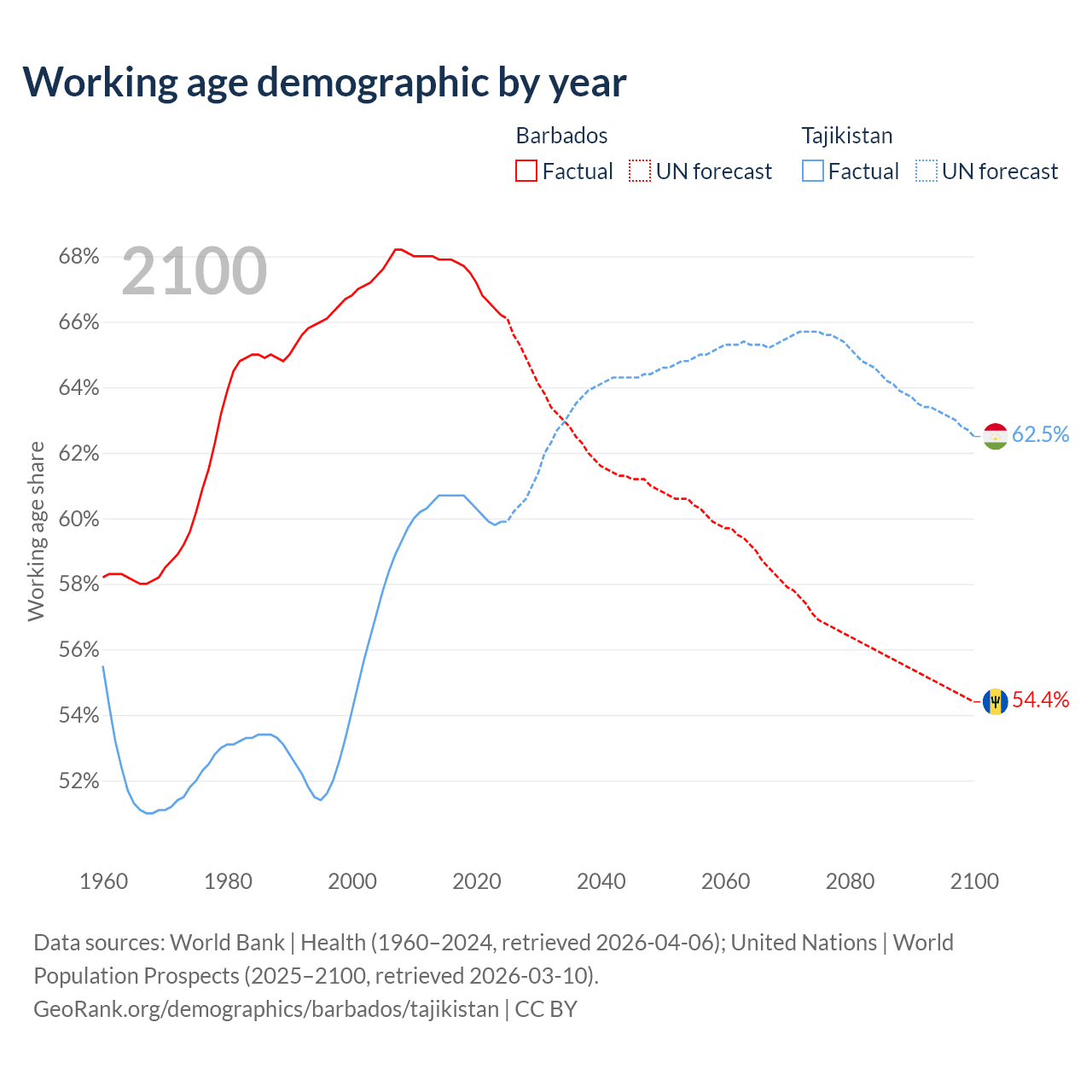 Median age Barbados vs Tajikistan, 1960-2100