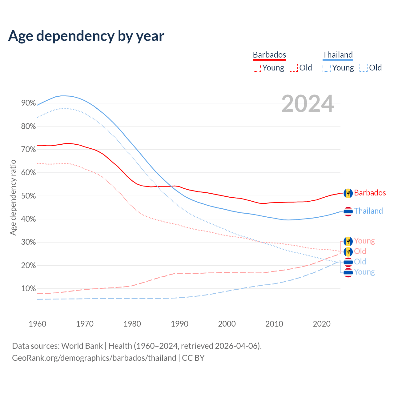 - Barbados is ranked 47/196 by median age (oldest to youngest) vs 40/196 for Thailand.