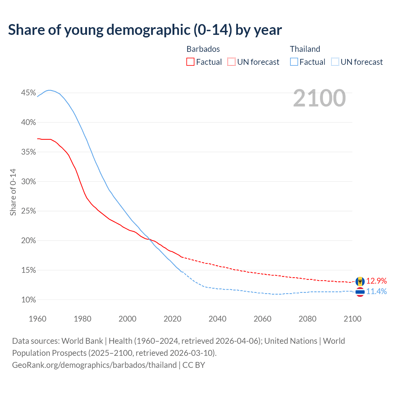 - The share of young demographic (0-15 years old) in Barbados is 17.2% vs 14.7% in Thailand.