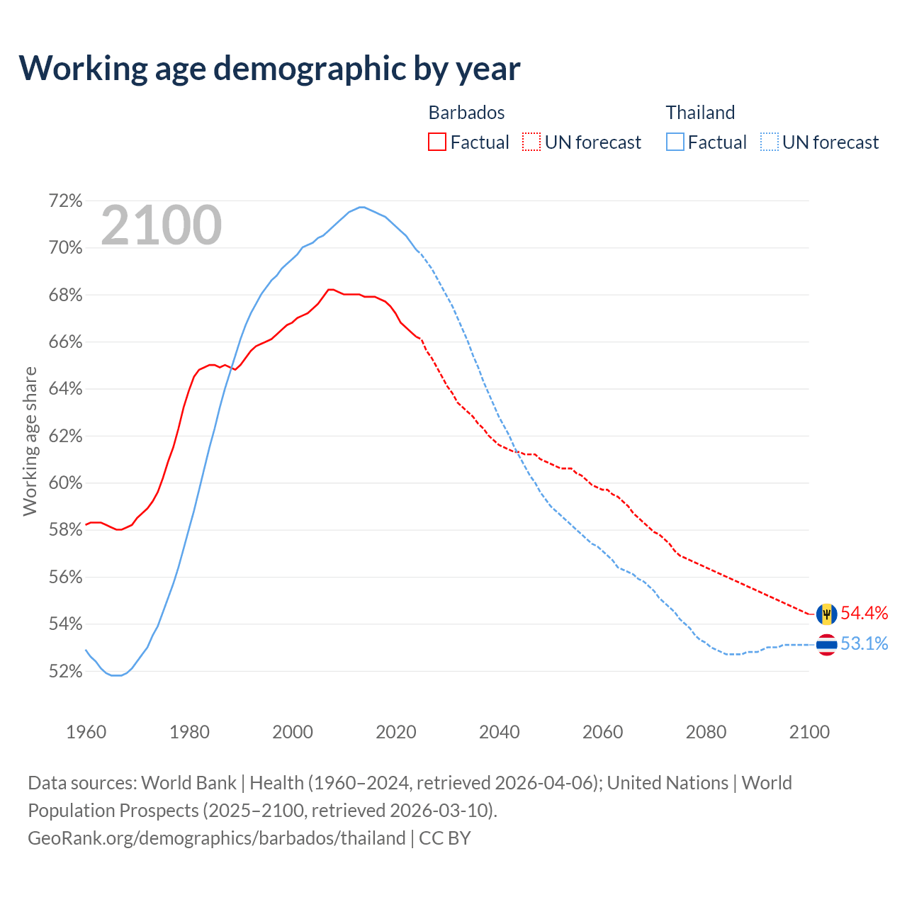 Median age Barbados vs Thailand, 1960-2100
