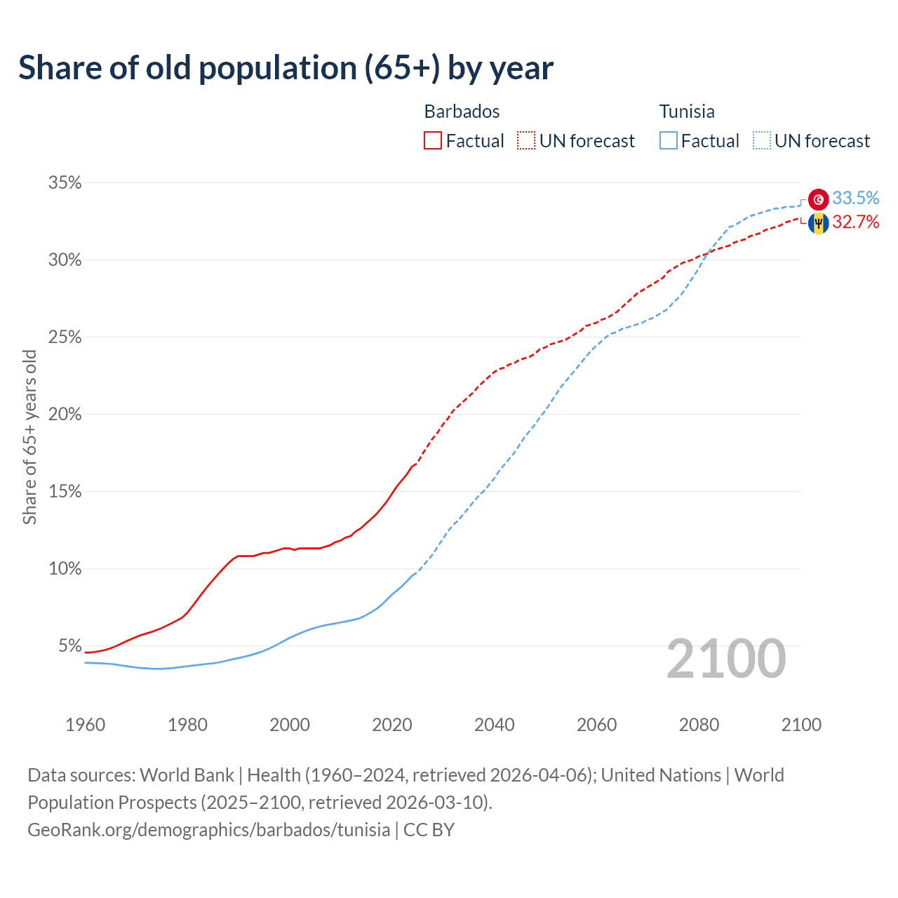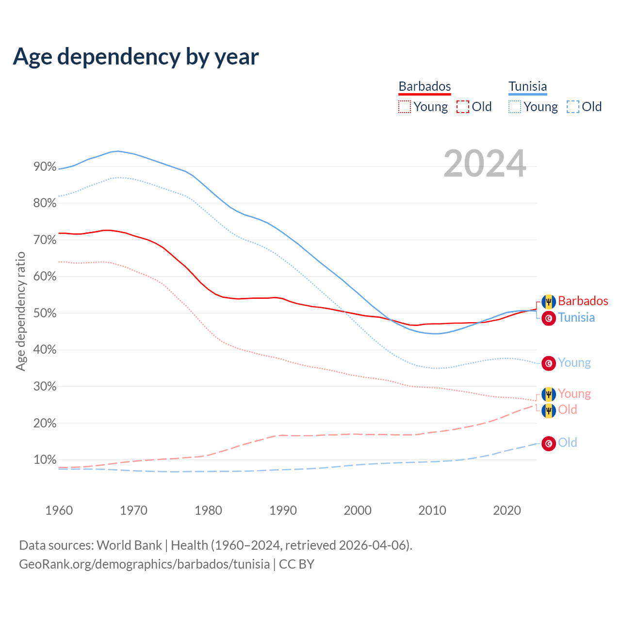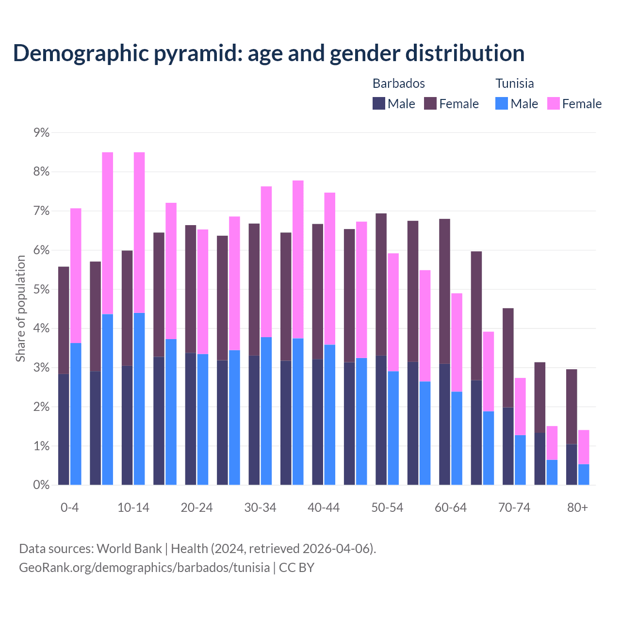 - Barbados is ranked 47/196 by median age (oldest to youngest) vs 86/196 for Tunisia.