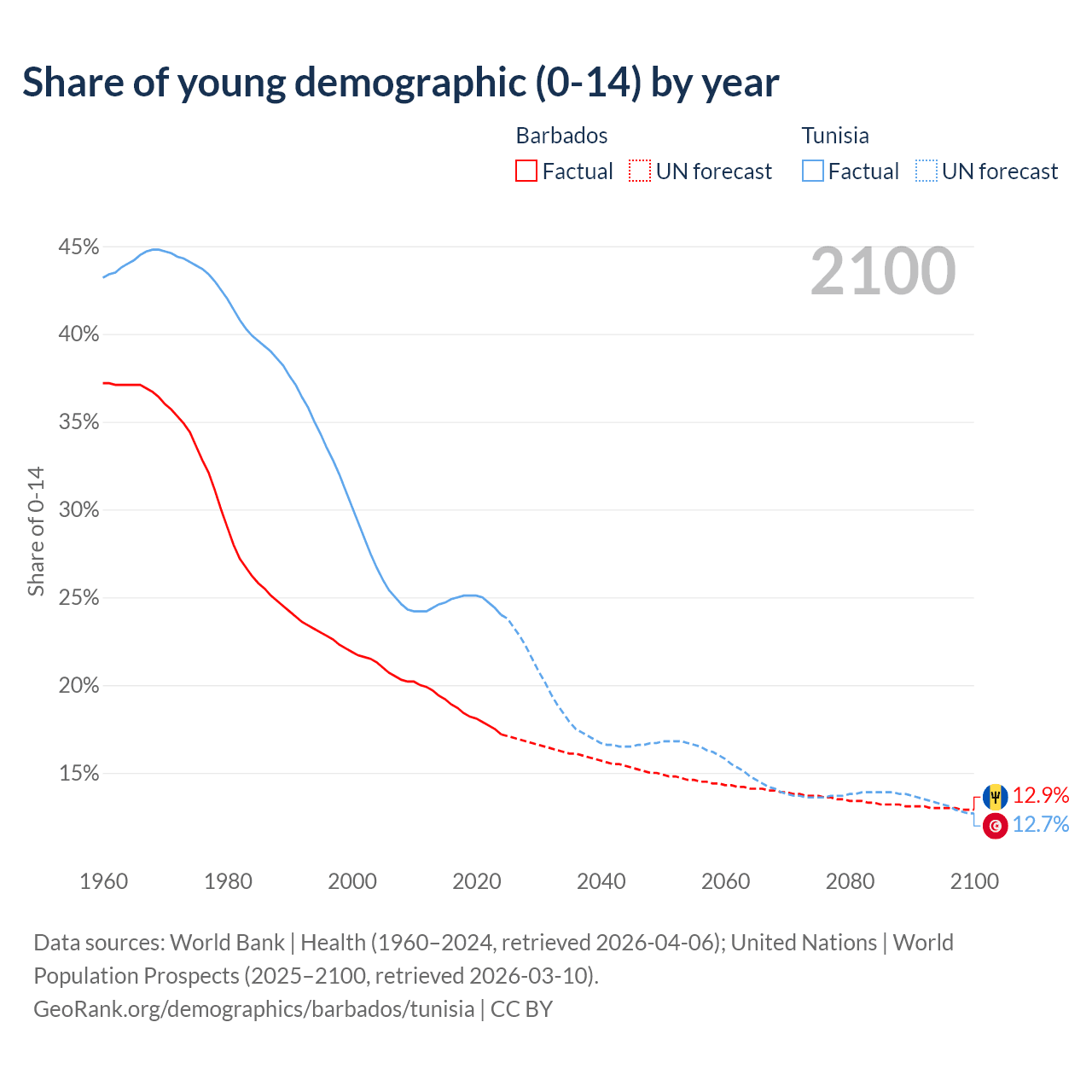 - The share of young demographic (0-15 years old) in Barbados is 17.2% vs 24% in Tunisia.