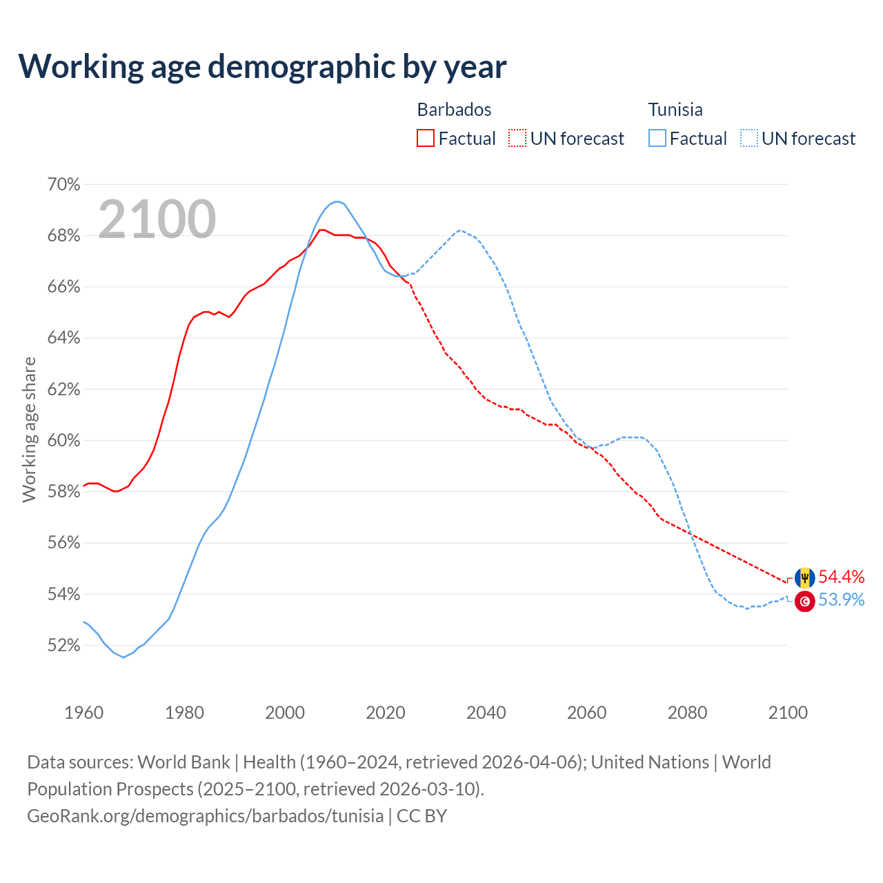 - Barbados has 187K working age adults (aged 15-64) vs 8.26M in Tunisia.