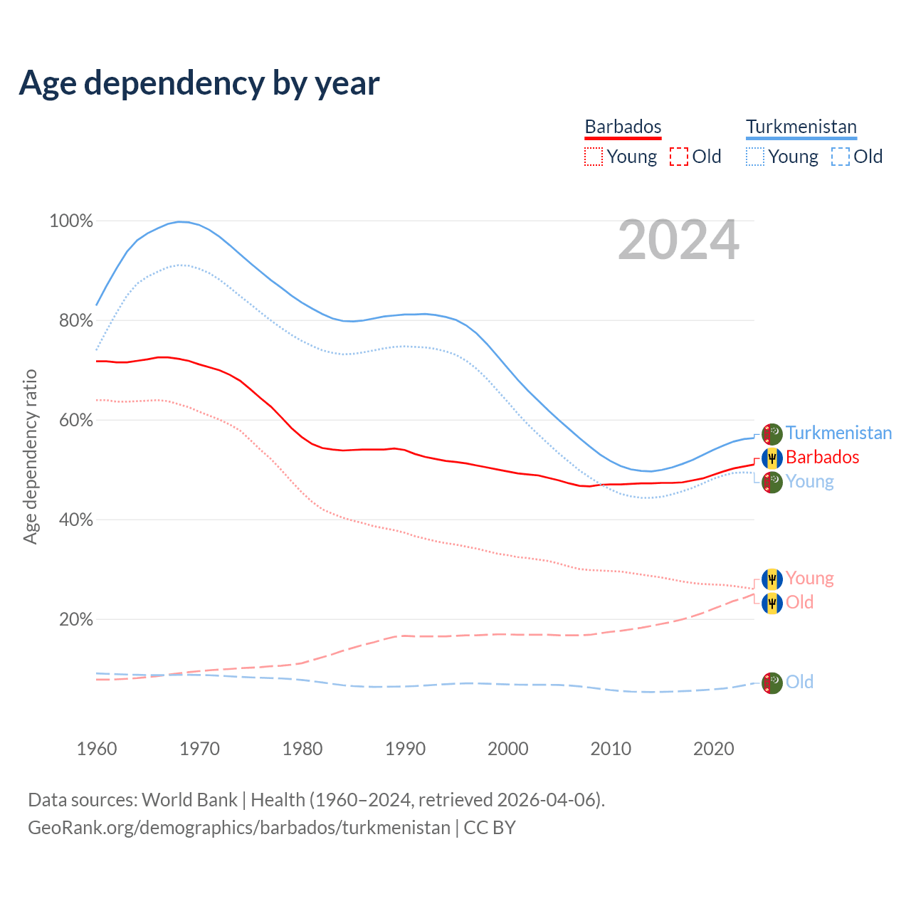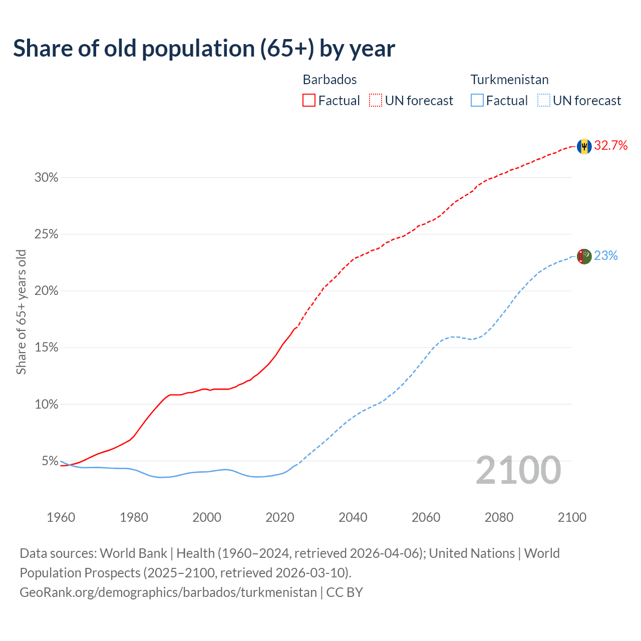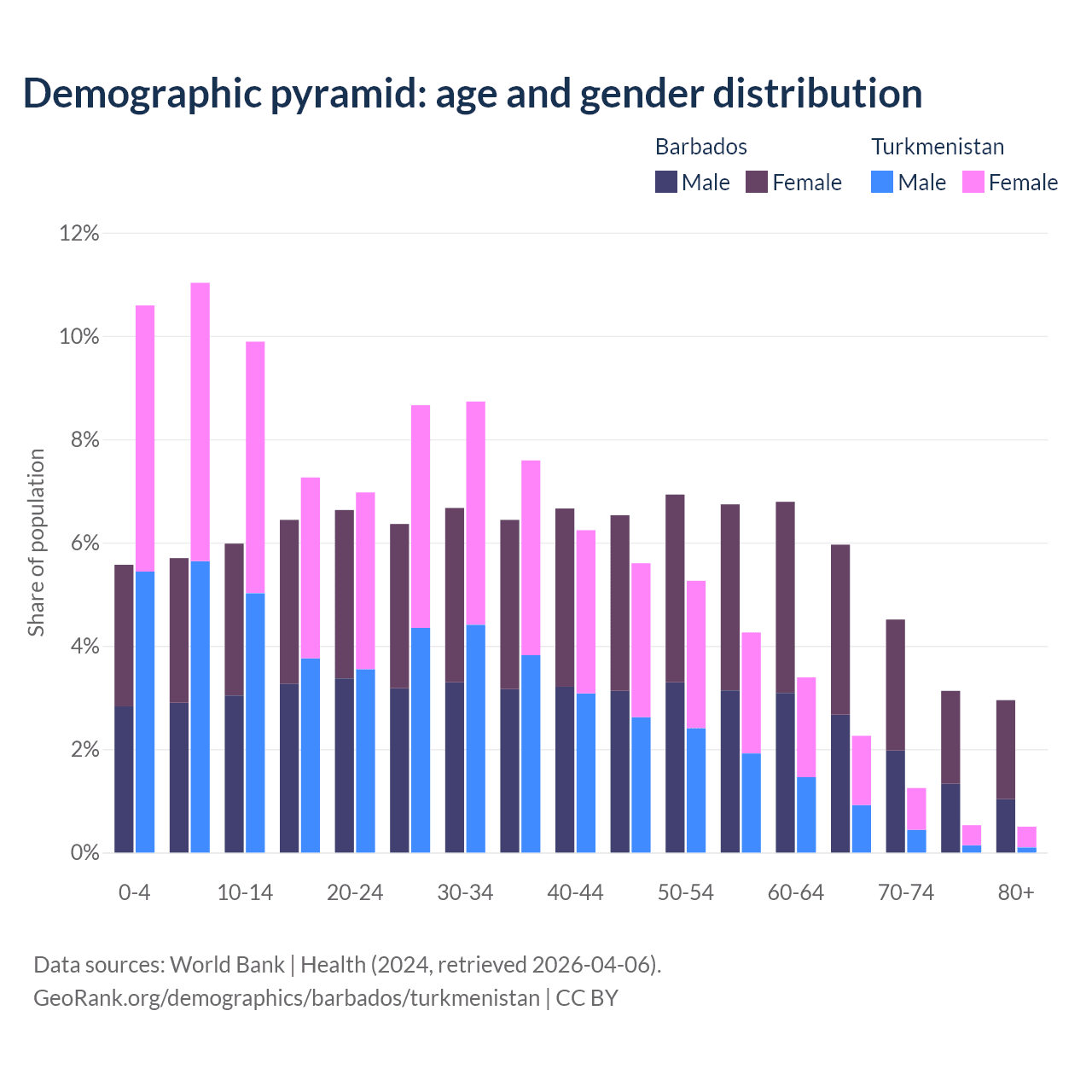 - The share of old-age demographic (65+) in Barbados is 16.6% vs 4.53% in Turkmenistan.