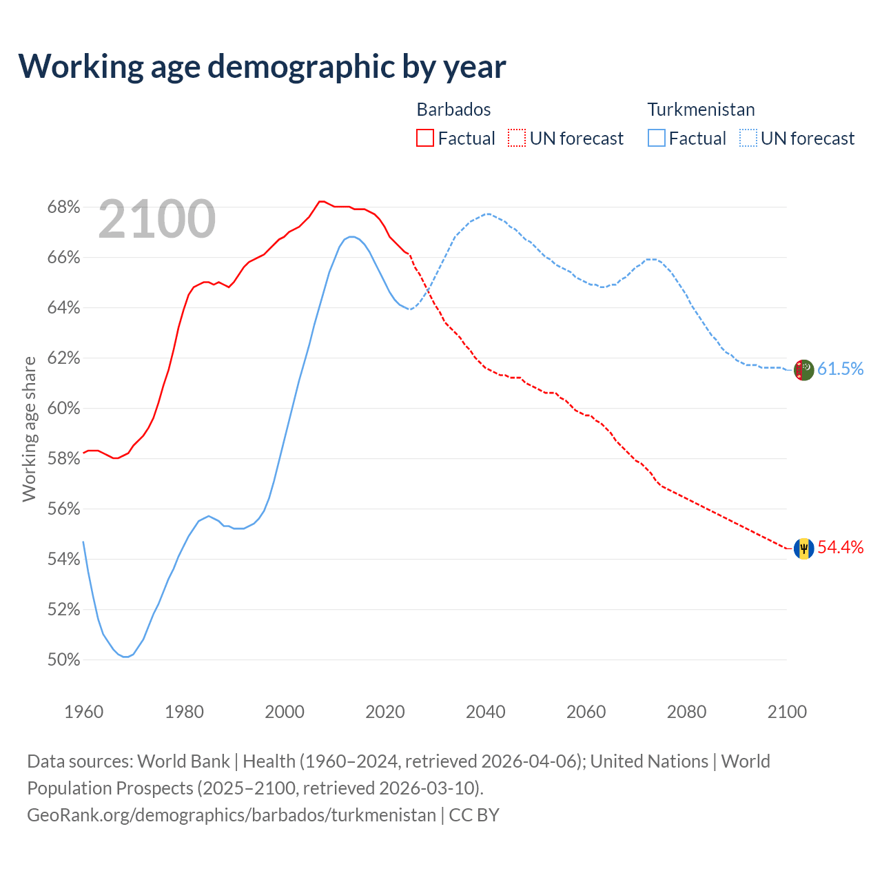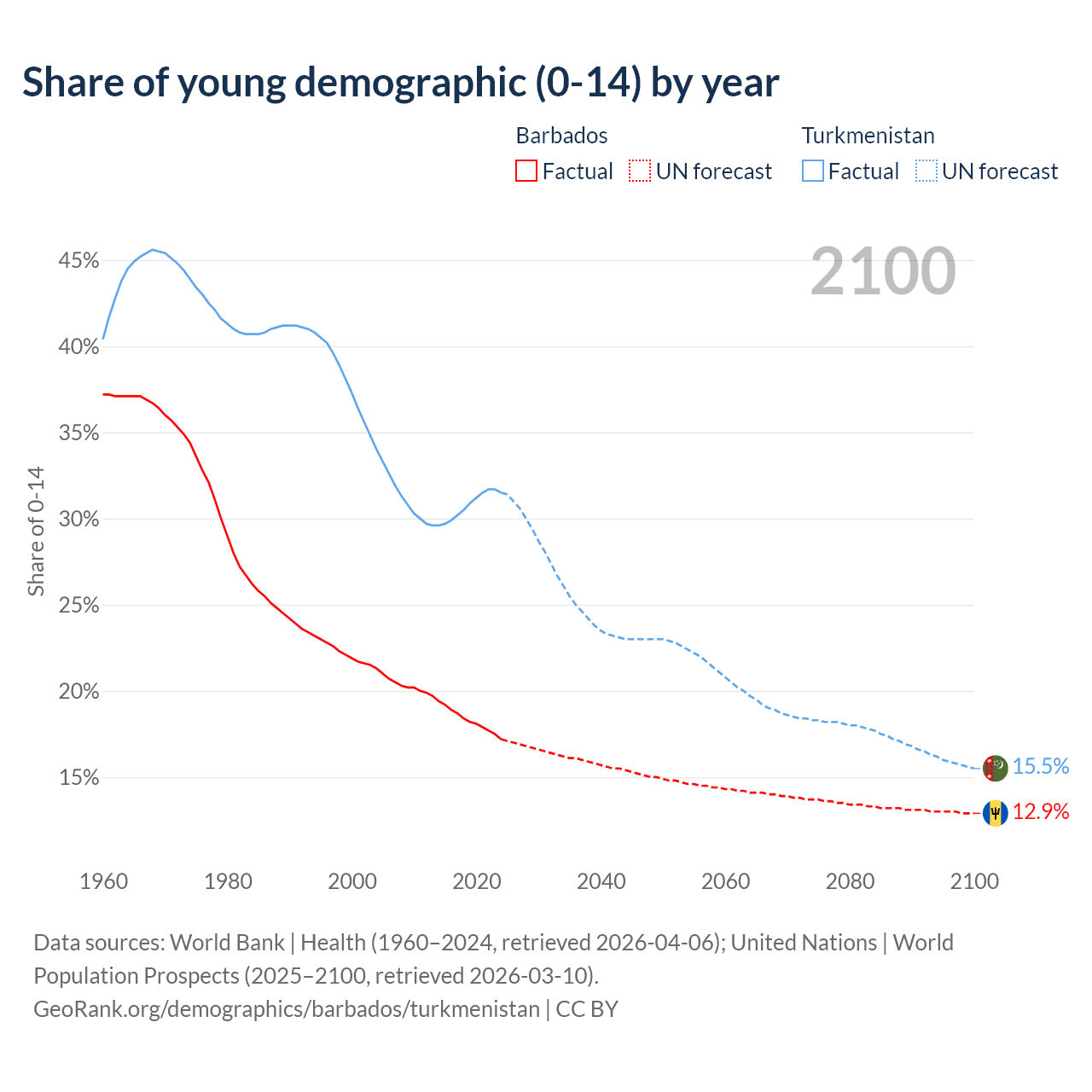 - The share of young demographic (0-15 years old) in Barbados is 17.2% vs 31.5% in Turkmenistan.