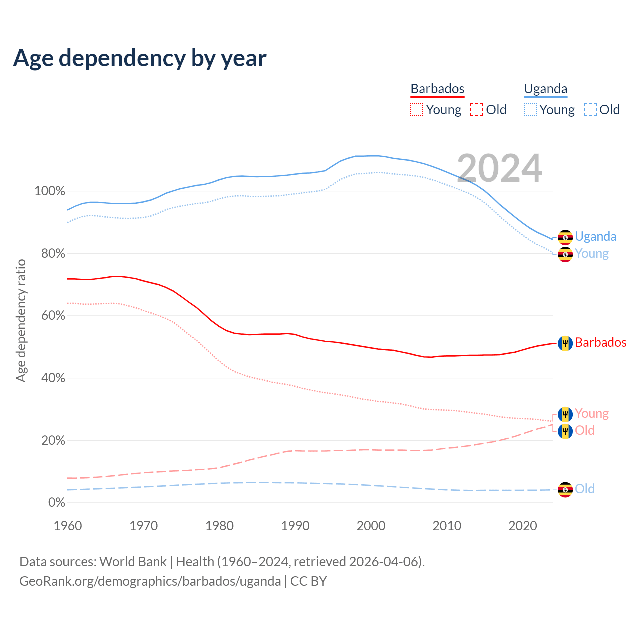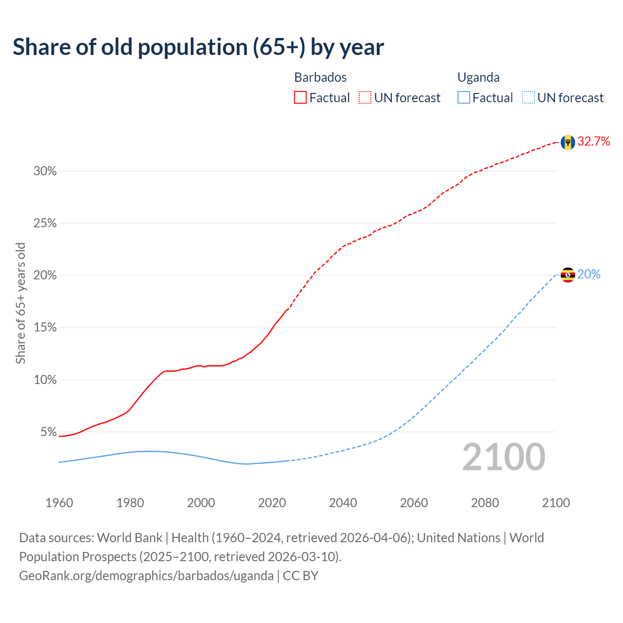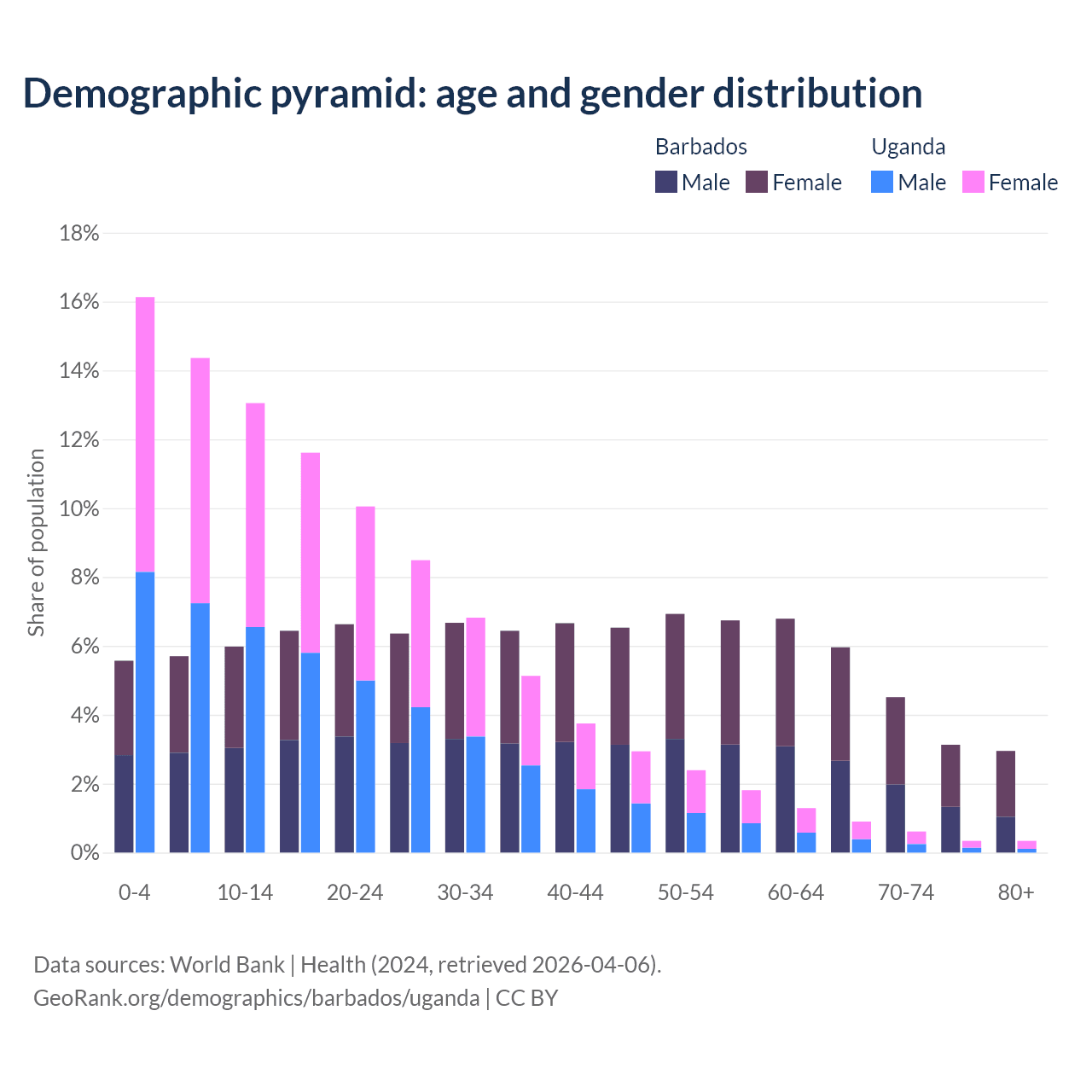 - The share of old-age demographic (65+) in Barbados is 16.6% vs 2.19% in Uganda.
