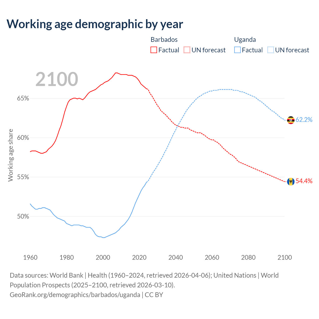 Median age Barbados vs Uganda, 1960-2100