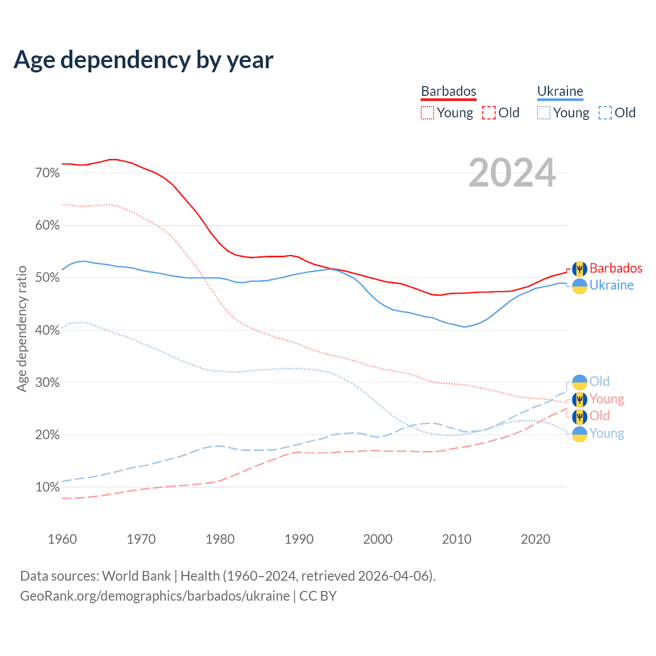 - Barbados is ranked 47/196 by median age (oldest to youngest) vs 26/196 for Ukraine.