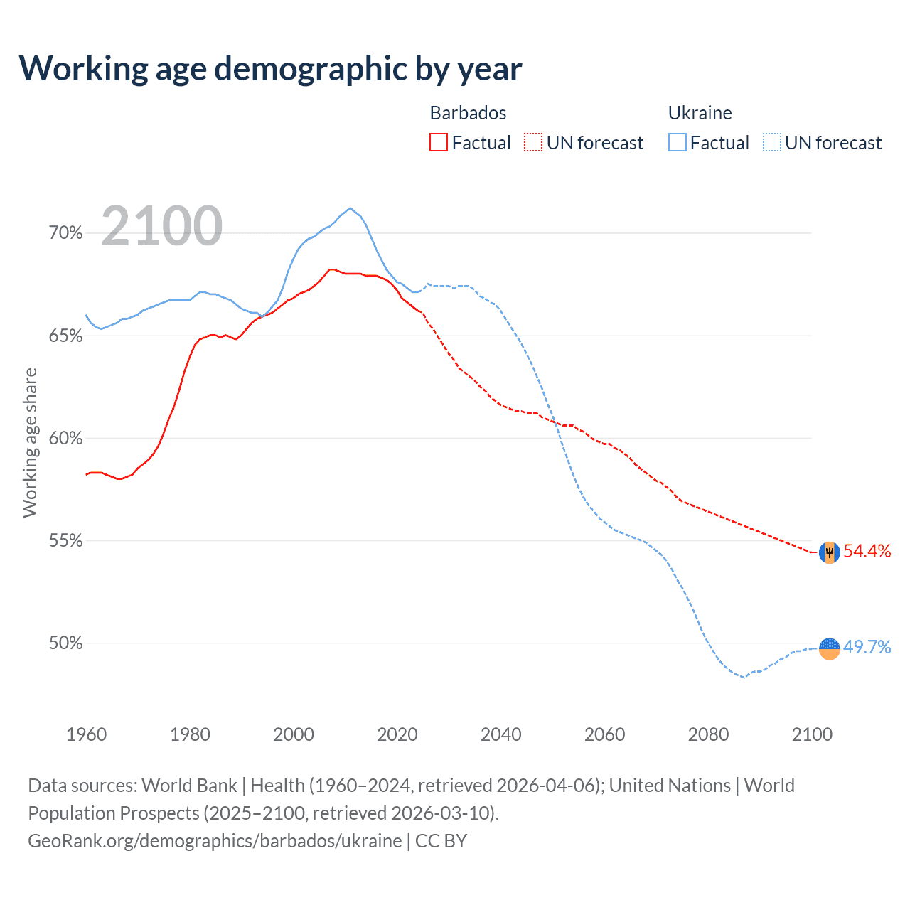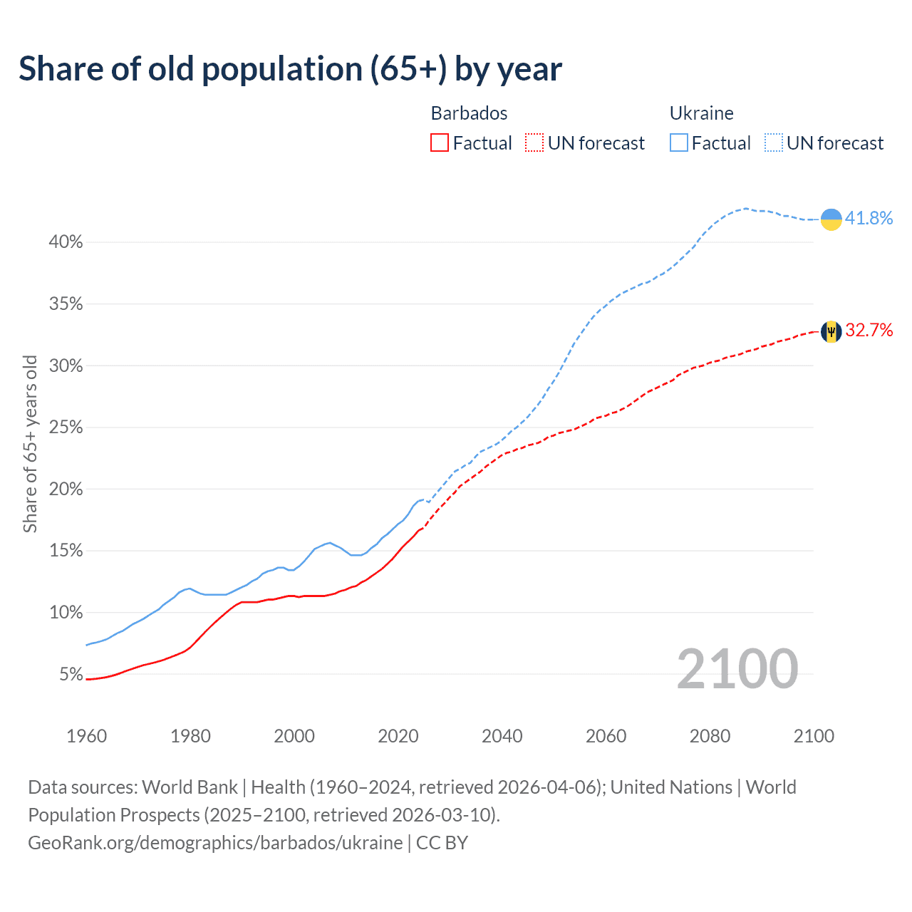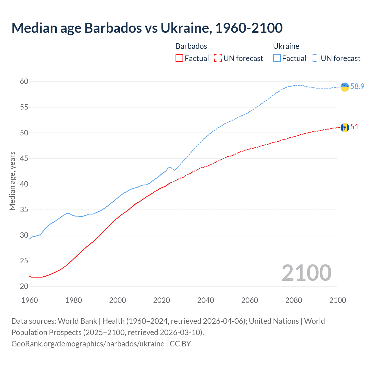 Median age Barbados vs Ukraine, 1960-2100