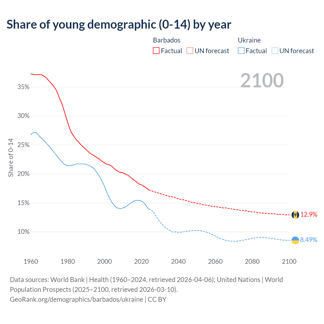 - The share of young demographic (0-15 years old) in Barbados is 17.2% vs 13.9% in Ukraine.
