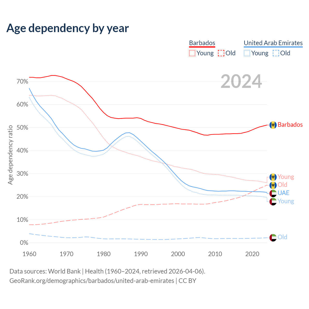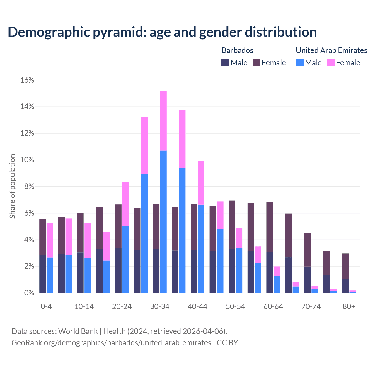 - The share of old-age demographic (65+) in Barbados is 16.6% vs 1.77% in the United Arab Emirates.